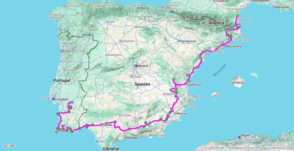 Portugal: Vila Real de Santo António; Castro Marim; Faro; Loulé; Benafim; Albufeira; Carvoeiro; Portimão; Alvor; Alferce; Monchique; Lagos; Sagres; Bordeira; Odemira; Sines; Santiago do Cacém; Ferreira do Alentejo; Alvito; Viana do Alentejo; Alcáçovas
