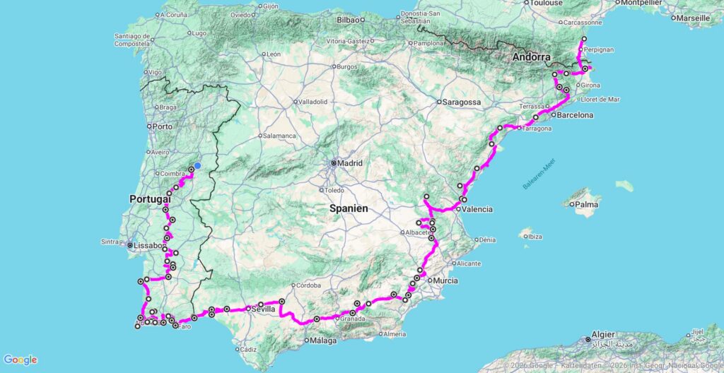 Portugal: … Monchique; Lagos; Sagres; Bordeira; Odemira; Sines; Santiago do Cacém; Ferreira do Alentejo; Alvito; Viana do Alentejo; Alcáçovas; Évora; Montemor-o-Novo; Brotas; Montargil; Ponte de Sor; Abrantes; Sertã; Oleiros; Covilhã; Belmonte