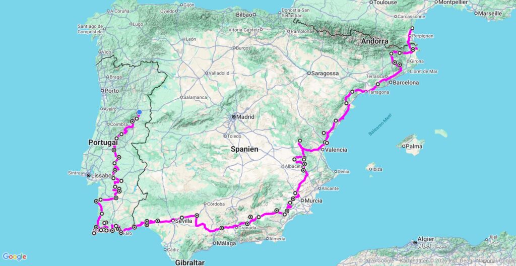 Portugal: … Monchique; Lagos; Sagres; Bordeira; Odemira; Sines; Santiago do Cacém; Ferreira do Alentejo; Alvito; Viana do Alentejo; Alcáçovas; Évora; Montemor-o-Novo; Brotas; Montargil; Ponte de Sor; Abrantes; Sertã; Oleiros; Covilhã; Belmonte; Guarda