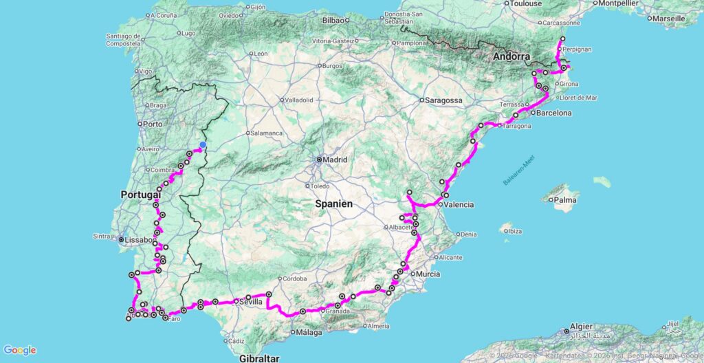 Portugal: … Monchique; Lagos; Sagres; Bordeira; Odemira; Sines; Santiago do Cacém; Ferreira do Alentejo; Alvito; Viana do Alentejo; Alcáçovas; Évora; Montemor-o-Novo; Brotas; Montargil; Ponte de Sor; Abrantes; Sertã; Oleiros; Covilhã; Belmonte; Guarda; Almeida