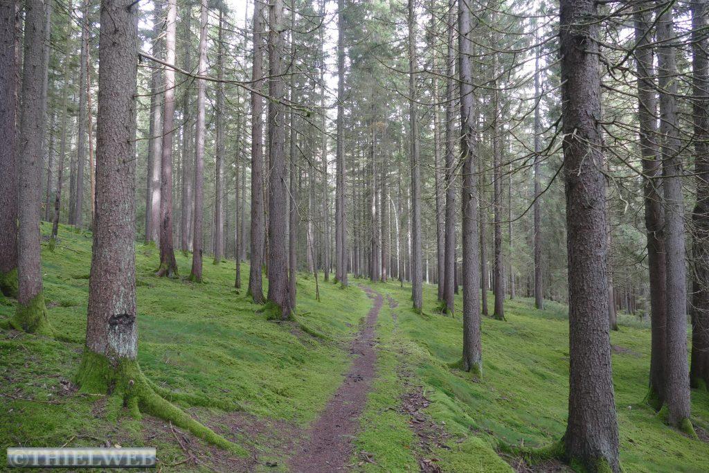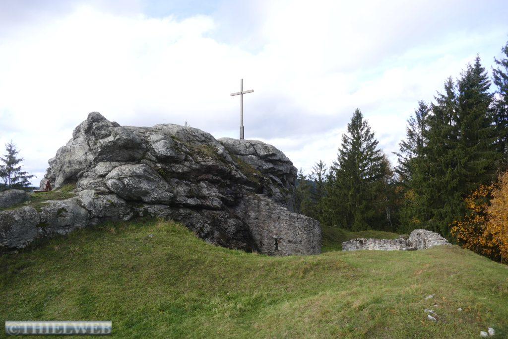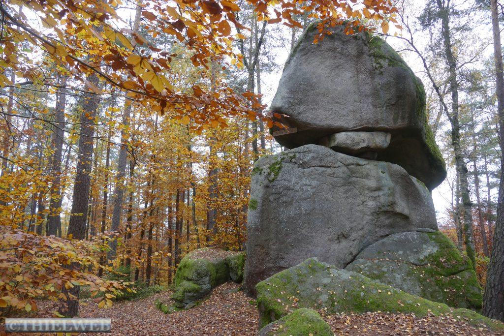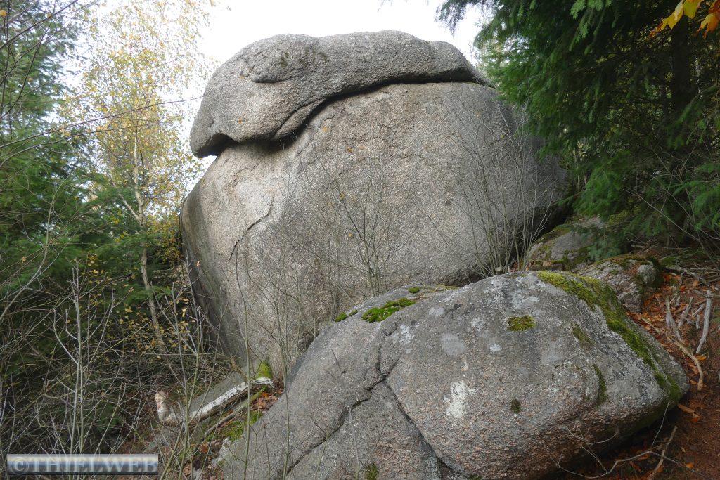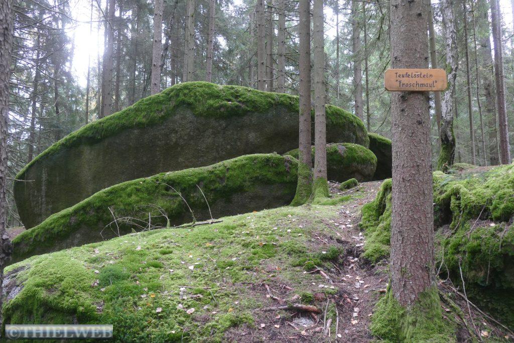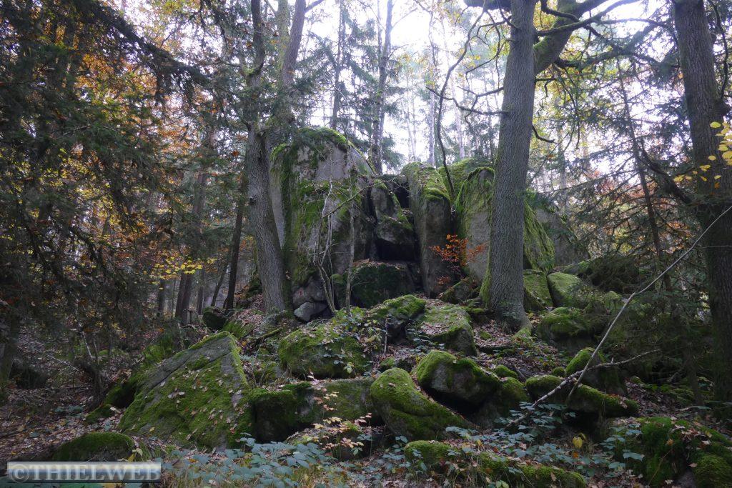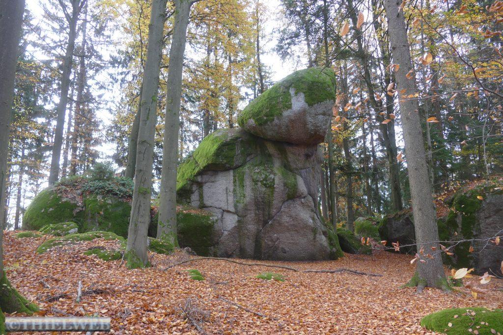 Das Wetter sieht gar nicht so schlecht aus. Da unser Außenthermometer gerade den Dienst versagt, wissen wir leider nicht, wie kalt es ist. Doch ohne Heizung geht es nicht. Wir wollen heute den Leuchtenberger Rundwanderweg wandern und fahren direkt auf abenteuerlicher kleiner steiler Straße hinauf zur Burgruine Leuchtenberg, dem Stammsitz des Adelsgeschlechts der Leuchtenberger. Dem Weg mit der Markierung Nr. 6 folgen wir durch Steinach und Lerau und zum Felsen Teufelsstein “Froschmau”. Durch das Waldgebiet „Elm“ führt der Wanderweg Nr. 5 bis zu einem Wegkreuz, wo wir einen Abstecher zu den „3 Handkreuzen“ an einer historischen Grenzmarkierung aus dem Mittelalter machen. Wir folgen dem Goldsteig in das Wildromantische Naturschutzgebiet Lerautal mit der Felsformation Wolfslohklamm und einem weiteren Abstecher zum Granitfelsen des Teufels Butterfass. Dann sind es nur noch wenige Meter und wir sind pünktlich zum Beginn des Regens wieder am Wohnmobil.