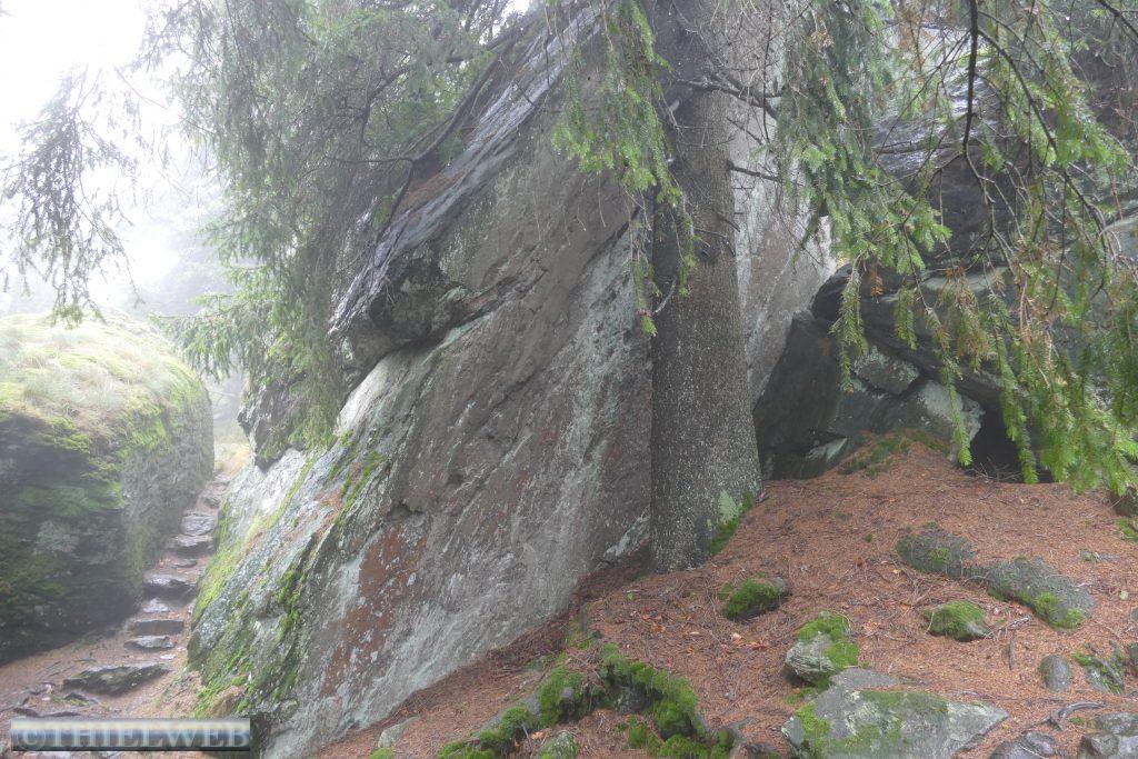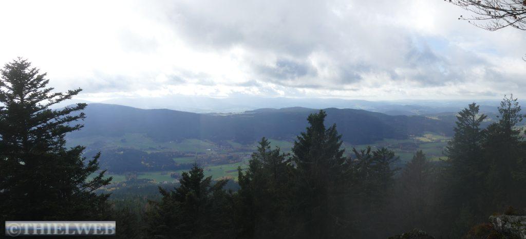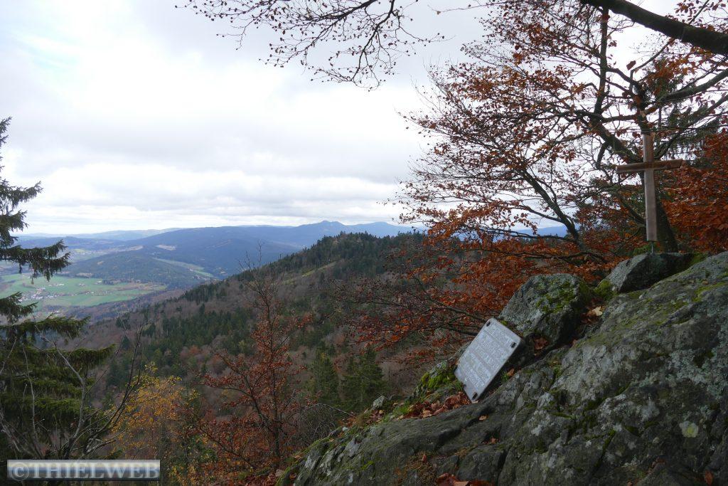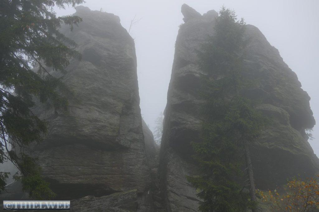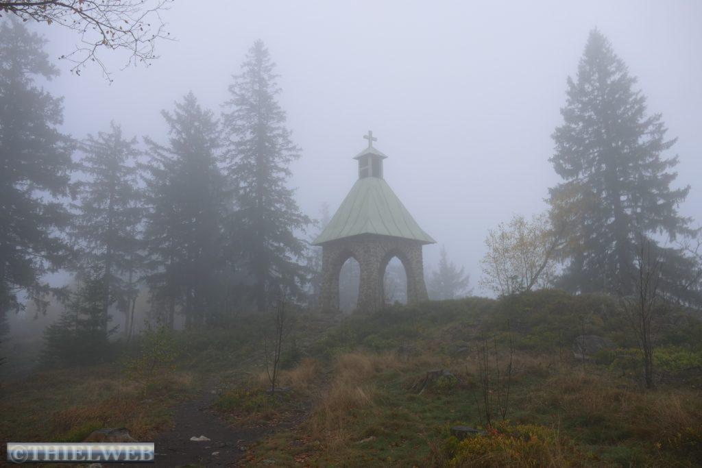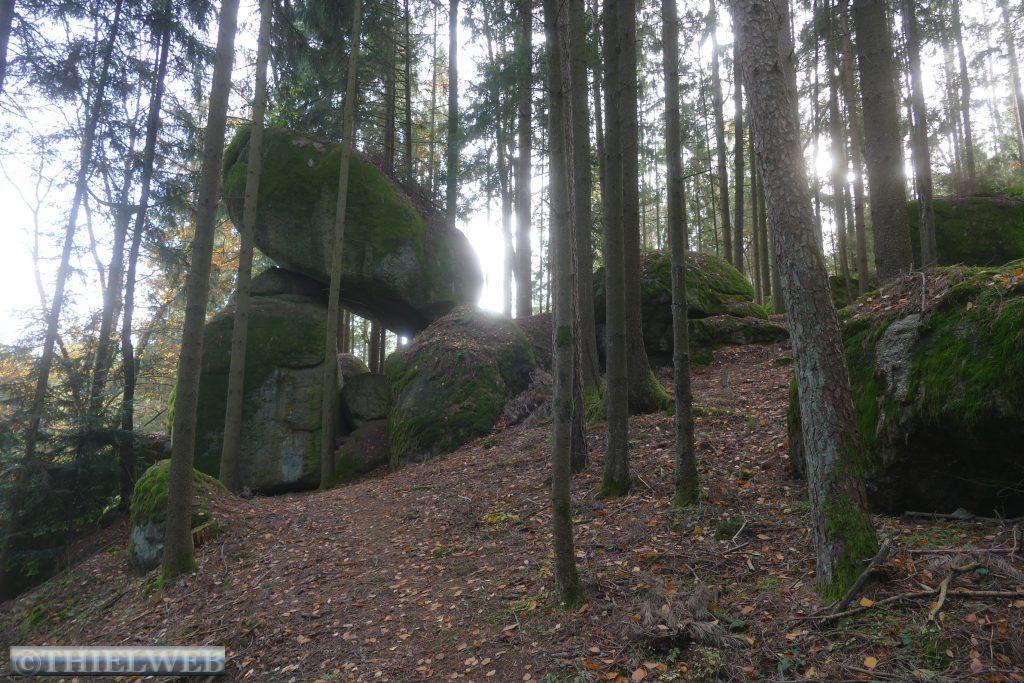Nicht weit von Neukirchen beim Heiligen Blut entfernt befindet sich der Ort Arrach, von dem aus wir heute den Panoramaweg Kaitersberg wandern wollen. Zum Glück gehen wir noch zur Touristeninformation, wo wir die Auskunft erhalten, dass die Tour 6 Stunden dauert. Wir könnten aber die Tour etwas abkürzen, ab dem Wanderparkplatz in Eschlsaign. Da das Wetter doch nicht so toll ist, nehmen wir den Vorschlag gern an. Gleich zu Beginn steigt der Weg stetig bergauf, bis wir den Kamm des Kaitersberges an der Kötztinger Hütte erreichen. Die Fernsicht ins umliegende Regental und Zellertal wird durch dichten Nebel, der von den Bäumen tropft, verwehrt. Der Wind bläst eiskalt auf 1.120 m Höhe. Wir folgen dem Kammweg, hinauf ins „Trümmerfeld“, mit einem Durcheinander an zerstückelten Quadern, Abbrüchen und Überhängen, die schon fast alpin wirken, weiter zum Naturdenkmal Rauchröhren. Zwei 30 m hohe, lotrechte Türme. Am Großen Riedelstein befindet sich das Naturdenkmal Waldschmidtdenkmal. Eine herrliche Aussicht ins Zellertal bietet sich uns bergab am Kleinen Riedelstein, als sich kurz die Sonne zeigt. Das letzte Wegstück verläuft immer bergab auf rutschigem Pfad, bis zu unserem Ausgangspunkt. Im Anschluss fahren wir noch nach Falkenstein.