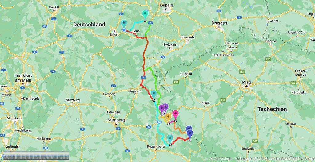 Wir bleiben noch einen Tag in Oberviechtach, da erst für die nächsten Tage eine Wetterbesserung angesagt ist. Der Wanderweg zur Burgruine Murach und durch die Wolfsschlucht startet in Obermurach. Im 17. Jahrhundert kämpften die Menschen der Oberpfalz mit einer Wolfsplage. Um deren Anzahl zu mindern, wurden Fangfallen, sogenannte Wolfsgruben erbaut, weswegen die Bezeichnung unseres Wanderweges daran erinnert. Wir folgen dem Goldsteig bis Pottenhof, wo wir den weiten Fernblick genießen. Der Weg führt stetig bergauf durch abwechslungsreichen Wald bis zum 621 m hoch gelegenen Johannisberg mit der Wallfahrtskirche aus dem 18. Jahrhundert. Pünktlich zum Beginn des Regens mit Gewitter sind wir wieder im Wohnmobil. Am Nachmittag fahren wir noch zur Tankstelle, um unsere LPG-Gasflasche zu füllen.