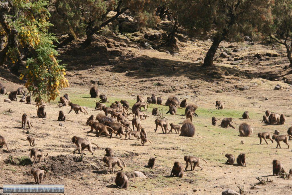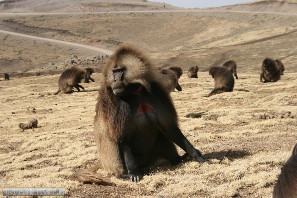 Drei der vier großen einheimischen Säugetiere Äthiopiens leben im Semien Gebirge. Wir setzen uns auf eine Wiese wo gerade die Gelada Paviane, die häufigsten im Hochland grasen. Sie leben in großen Gruppen und geben Laute von sich, die an eine Unterhaltung erinnern. Ernähren tun sie sich von Gras, Früchten und Wurzeln. Charakteristisch ist die rosarote, nackte Hautstelle an Brust und Kehle, die ihnen auch den Namen Blutbrustpavian einbrachte. Der Walia Steinbock, der hier noch verhältnismäßig oft gesehen wird und der Simien-Fuchs, der sehr selten geworden ist. Nach dem Trekking ist Debark, ein kleines Städtchen am Fuß des Ras Dashen unser Ziel für die Übernachtung