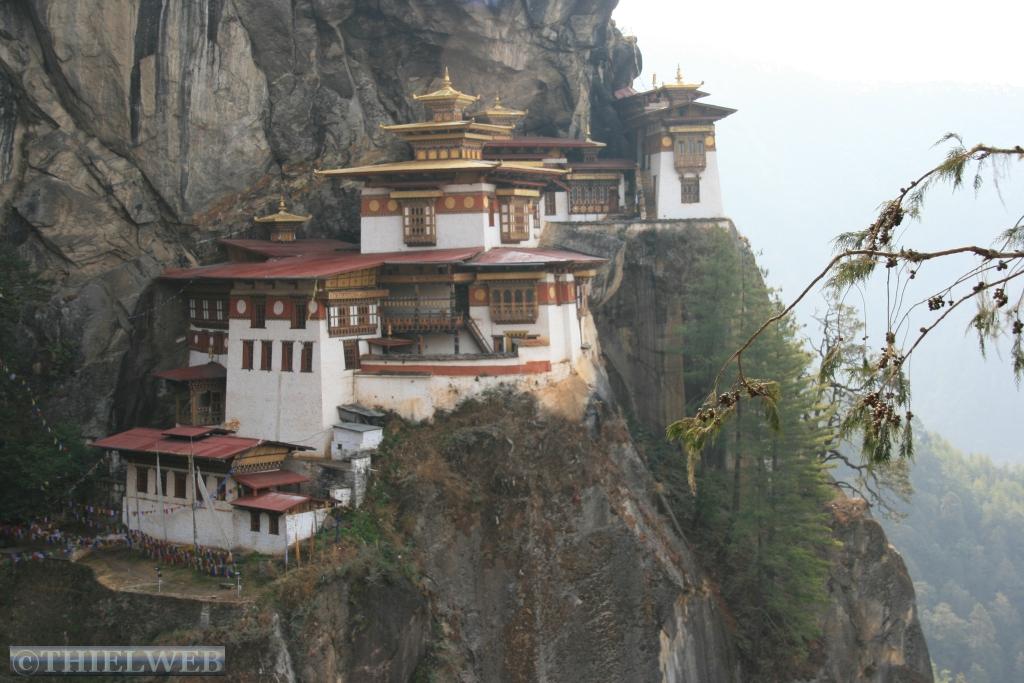 Eine kurze Fahrt bringt uns anschließend nach Ramthangka. Von hier starten wir zu dem knapp 2-stündigen Aufstieg nach Taktshang – dem Tigers-Nest – Bhutans berühmtestem Kloster. 900 m über dem Paro Valley „klebt“ das Tigers-Nest an den Felsen – fern ab von Motorengeräuschen können wir hier den Gesängen der Mönche und dem die Felsen um fegenden Wind lauschen. Der Bau des Schreins am Hang einer steilen Klippe in einer Höhe von 3 120 Metern über dem Meeresspiegel errichtet. Wurde 1692 abgeschlossen. Die Geschichte des Ortes ist untrennbar mit dem Namen Guru Rinpoche verbunden, der von vielen Bewohnern des Landes als zweiter Buddha geehrt wird.