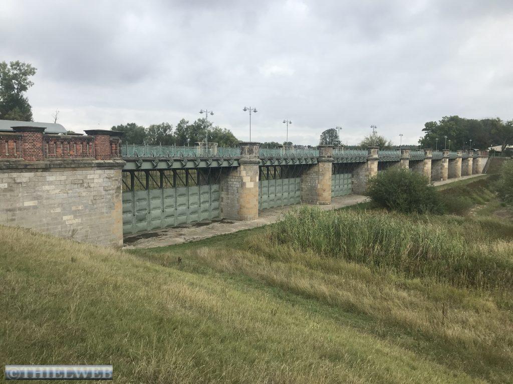 Linksseitig flussaufwärts bringt uns der Elberadweg bis Ranies. Zuvor kamen wir noch zum Pretziener Wehr vorbei, eine 140 Jahre alte technische Meisterleistung, die zur Weltausstellung 1875 in Paris eine Goldmedaille erhielt. Da die Brücken über die Elbe nicht so häufig sind, entscheiden wir uns über Schönebeck zu radeln, um dort die Elbe zu queren. Das Wetter ist heute nicht so radfreundlich, bei kühlen Temperaturen, bedeckten Himmel und starkem Gegenwind. So sind wir schon am frühen Nachmittag zurück und spazieren nun bei einem zaghaften Sonnenschein durch Magdeburg.
