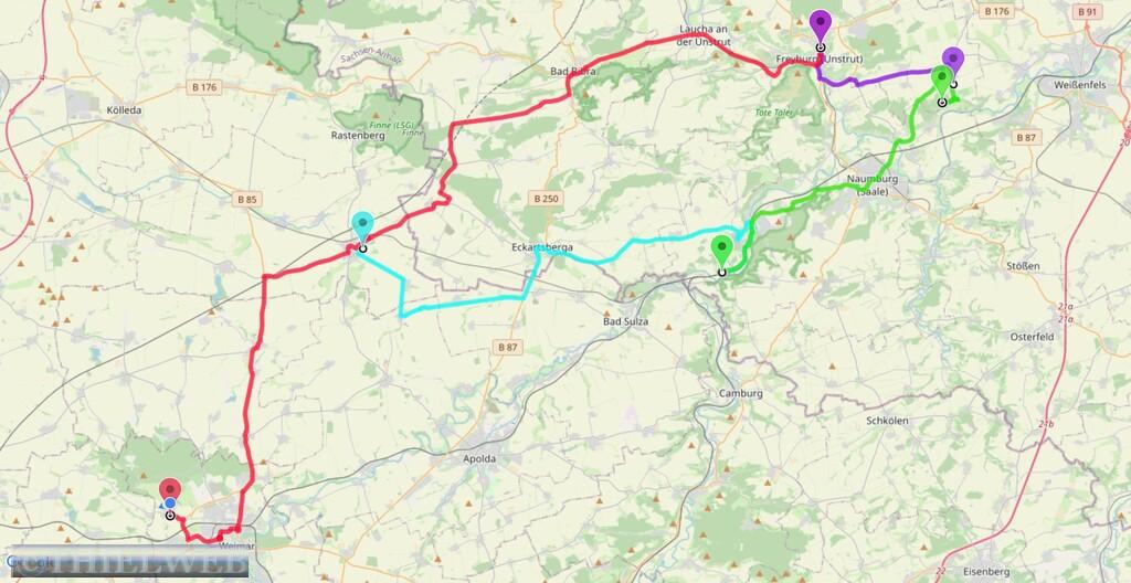 In den frühen Morgenstunden überrascht uns ein nicht vorhergesagter Regen. So bleiben wir noch etwas im Bett, denn in der Nacht hat uns der rege Zugverkehr direkt neben unserem Stellplatz des Öfteren aus dem Schlaf gerissen. Nach dem Frühstück sind alle Wolken verzogen und wir starten zum Aufstieg zur Burg Saaleck. Nicht weit entfernt ist dann auch schon die Rudelsburg erreicht. Mehrere Gedenksteine, unter anderem ein Denkmal des jungen Bismarck folgen. Wir folgen dem Weg zum Rittergut Kreipitzsch und über Feiroda nach Bad Kösen. An der Saline machen wir eine kleine Pause, bevor wir an der Saale zurückwandern. Am Nachmittag beschließen wir, da unser Ersatzteil immer noch nicht bei Rossol eingetroffen ist, weiter nach Goseck zu fahren. Nach ein wenig Suchen haben wir dann unseren Stellplatz am Waldsportplatz gefunden.