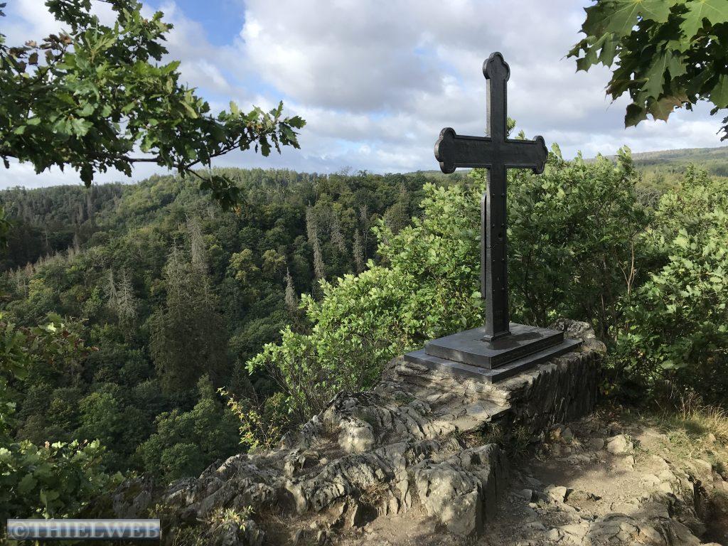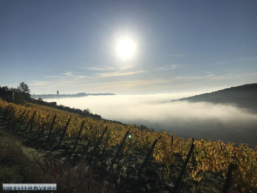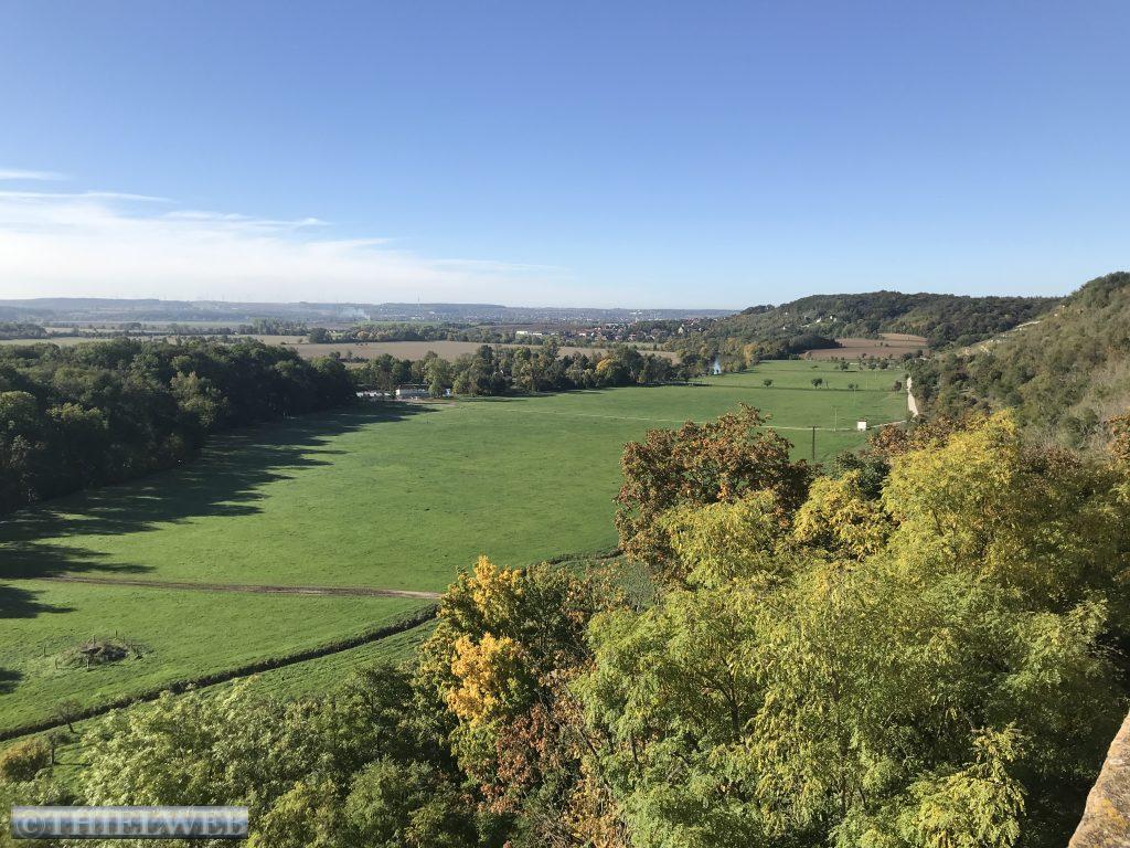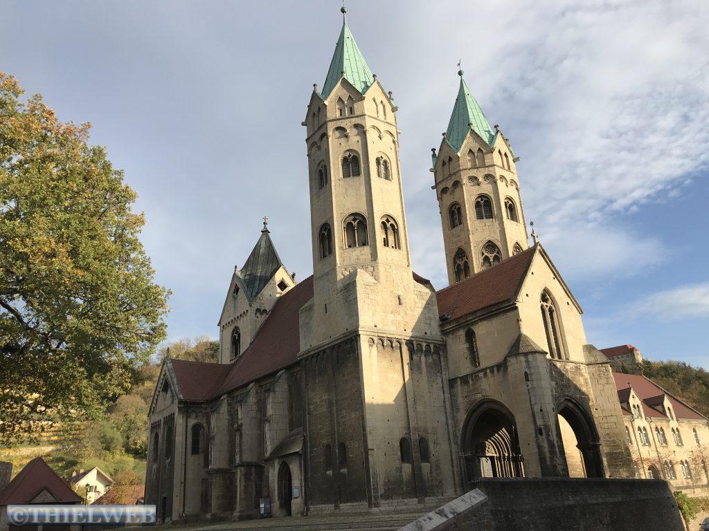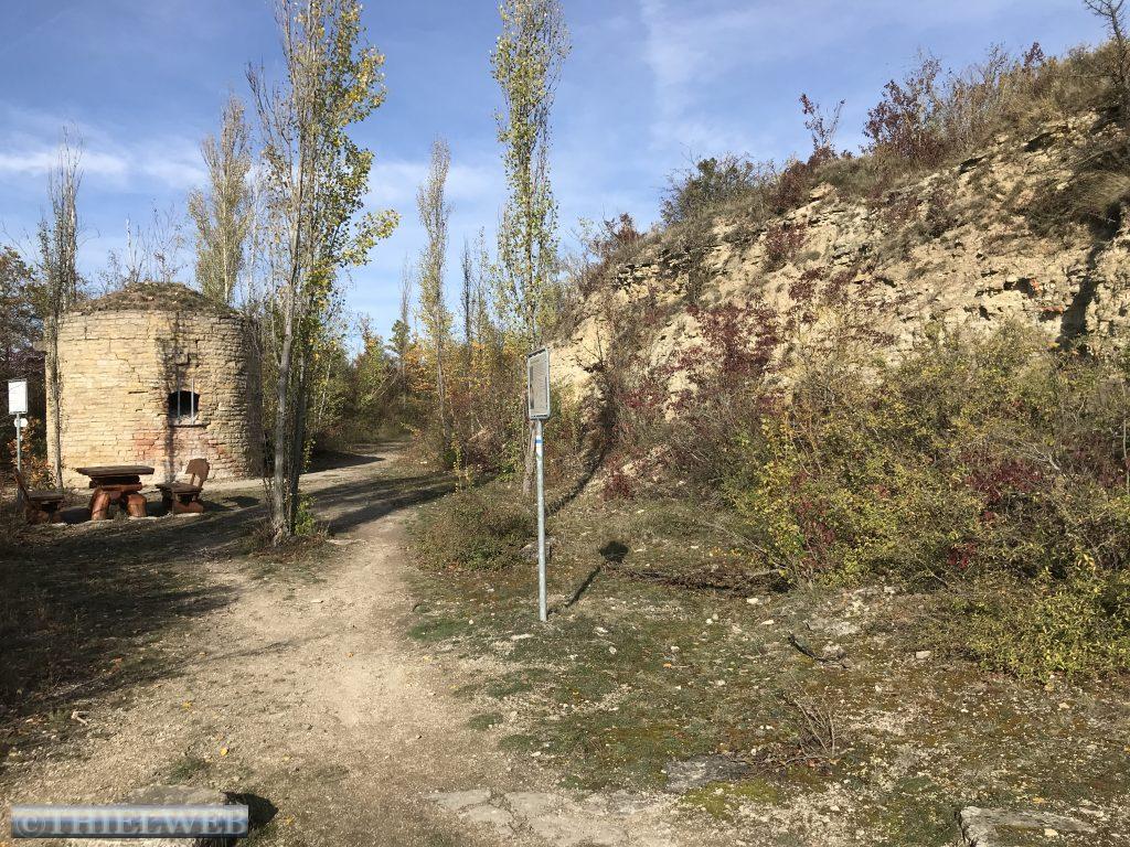 Noch liegt Nebel über der Stadt, als wir den Schweigenberg hinaufklettern. Entlang der Weinberge wandern wir weiter Richtung Müncheroda und auf den Nüssenberg. Unterwegs kommen wir am Magdstein und am etwas abseits stehenden Sühnekreuz vorbei. Der Weg führt oberhalb von Weischütz wieder durch Weinberge. Hier hängen noch blaue Trauben und wir erfahren von zwei Männern, dass dieser Weinberg im Frühjahr Frost bekommen hat, und deshalb nicht bewirtschaftet wurde. So können wir von den leckeren Trauben naschen, bevor wir wieder bergan nach Zscheiplitz auf dem Geologischen Pfand weiter wandern. Kurz nach dem ehemaligen Steinbruch legen wir eine Rast am ehemaligen Kalkbrennofen ein. Vorbei an der Klosterkirche von Zscheiplitz erreichen wir schon bald wieder Freyburg.