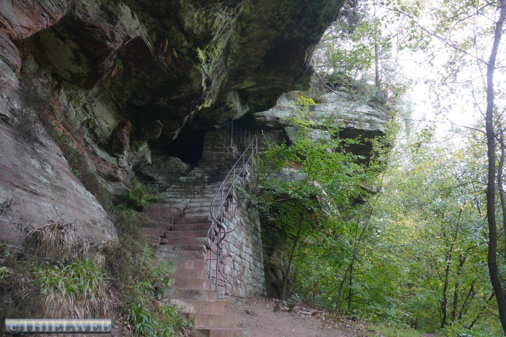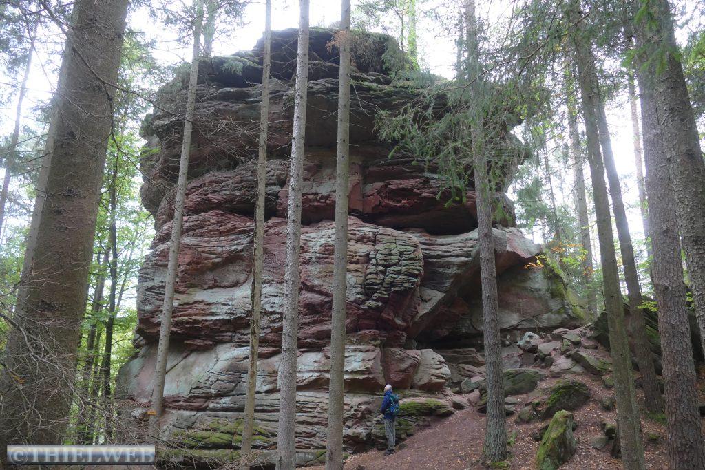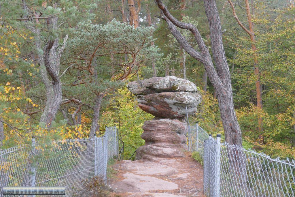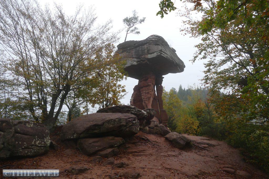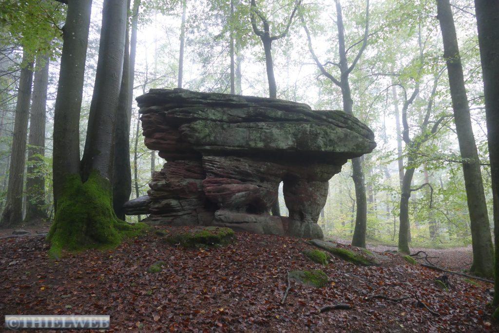 Die Wettervorhersage sagt heute wieder Regen voraus. Wir fahren nach Hinterweidenthal. Hier beginnt der Wanderweg zum Teufelstisch. Das aus Buntsandstein bestehende Naturdenkmal, mit 14 m Höhe, zählt zu den Top Ten der Naturwunder Deutschlands. Da es bereits nach 1 km zurückgelegtem Weg zu regnen beginnt, beginnen wir an diesem einzigen Geotop in der Pfalz. Nach den ersten Kilometern kommen wir zur Teufelsschmiede, einem mehrschichtigen Buntsandsteingebilde. Der schöne Waldpfad bringt uns im ständigen Auf und Ab parallel zum Lauf des Salzbachs nach Salzwoog. Die schönen Rastplätze mit Wellenbänken und Aussichten auf die umliegenden Berge können wir heute leider nicht genießen. Nach ca. 10 km haben wir wieder Hinterweidenthal erreicht, und sind stolz, trotz des Regens die Wanderung durchgeführt zu haben. Anschließend fahren wir nach Klingenmünster, was am Pfälzer Weinstieg liegt.