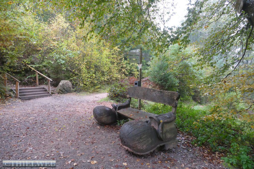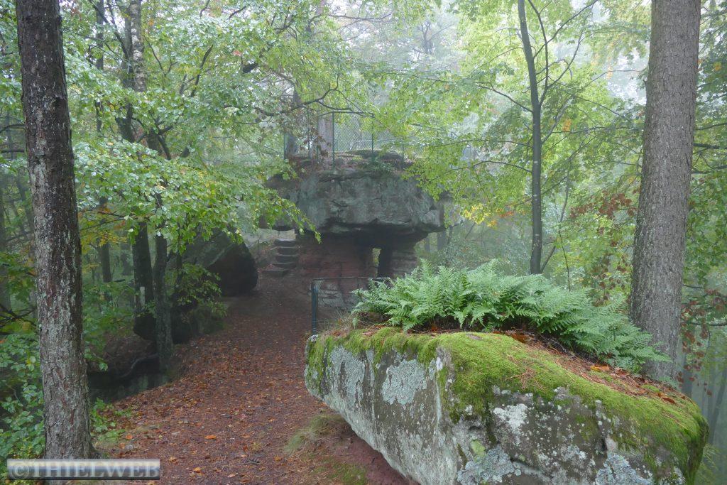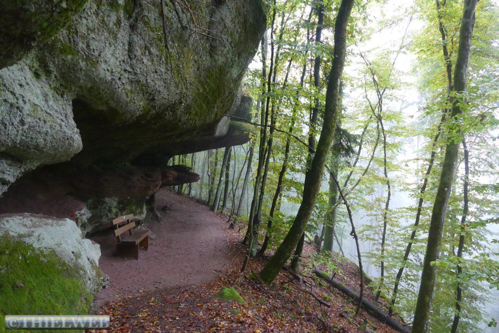 Die Wahl des Stellplatzes war eine gute Entscheidung. Hier können wir erst einmal mit Entsorgung ausharren, es schüttet schon seit gestern Abend. Gegen Mittag lässt der Regen nach und wir starten zum Graf-Heinrich-Weg. Unterhalb der Burgruine Lehmberg beginnt der Waldweg bis zum imposanten Rabenfelsen immer entlang der beeindruckenden Felslandschaft. Ab hier ist es nicht mehr weit bis zum Ringberg, den wir mit Hilfe einer Metallleiter erklimmen. Nun können wir die schöne Aussicht genießen. Der Wanderweg führt im leichten Auf und Ab entlang des Höhenrückens durch bemoosten Wald. Wir erreichen die Natursteinstufen, die zum Plateau des Ruppertstein hinaufführen. Dichte Nebelschwaden steigen aus dem Wald, dahinter ist? Wir können es nicht sehen. Zum Teil recht anstrengende Aufstiege sind jetzt zu bewältigen, bis der Maiblumen-Fels erreicht ist. Hier fängt es leider ordentlich an zu regnen. Mit strammen Schritt bewältigen wir den letzten Anstieg bis zur Schutzhütte Klosterbrunn. Danach geht es nur noch talwärts, bis wir unseren Parkplatz wieder erreichen.