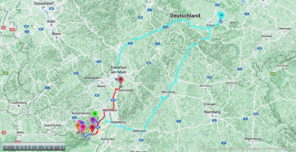 Die Entscheidung zu fahren oder nicht, hat uns das wechselhafte Wetter schwer gemacht. Schließlich sind wir doch bei trüben Nieselwetter nach Rheinland-Pfalz gestartet. Hinter dem Thüringer Wald lichteten sich die Wolken und gaben auch ein paar Sonnenstrahlen die Chance. Wir sind über Schweinfurt und Würzburg gefahren, um dem Freitagsverkehr um Frankfurt zu entgehen. Doch auch auf unserer gewählten Strecke gab es mehrere Baustellen und zähfließenden Verkehr, sodass wir später als gedacht in Lambrecht am Stellplatz angekommen sind.