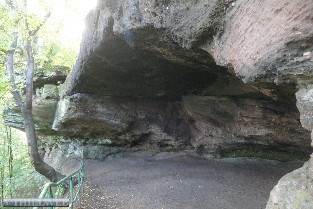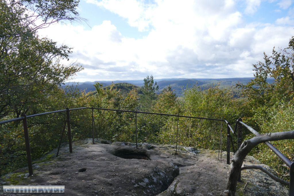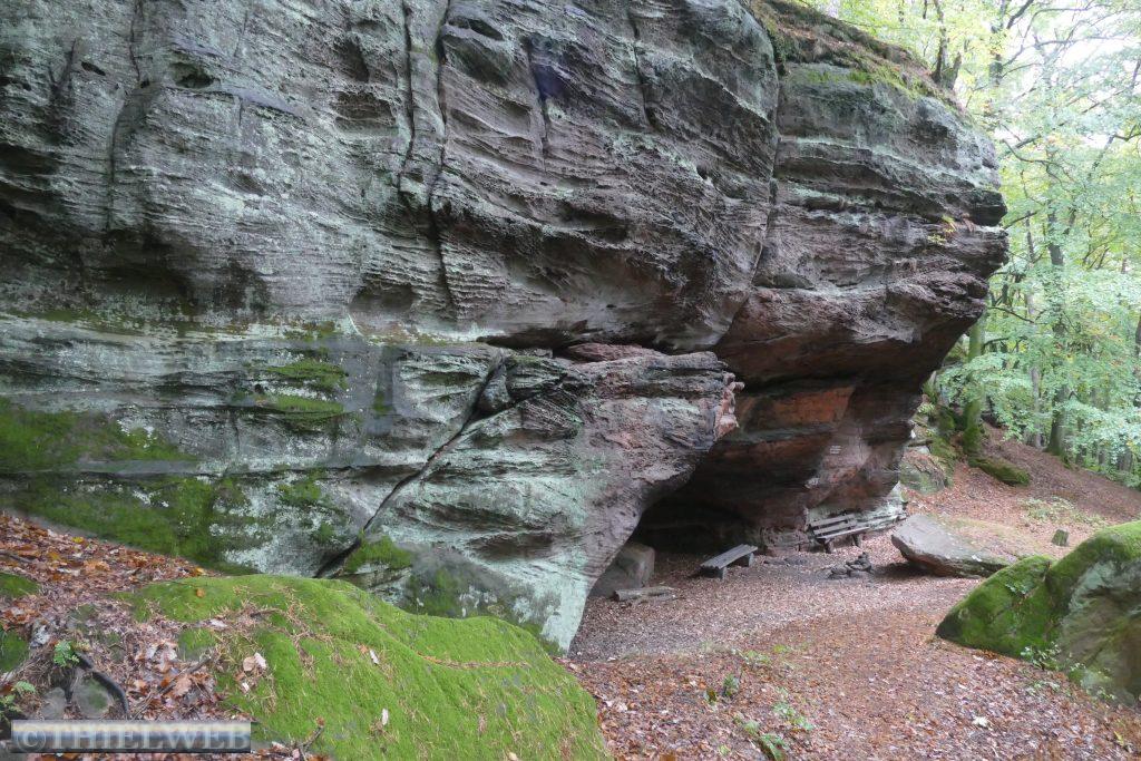 Die Wahl des Stellplatzes war eine gute Entscheidung. Hier können wir erst einmal mit Entsorgung ausharren, es schüttet schon seit gestern Abend. Gegen Mittag lässt der Regen nach und wir starten zum Graf-Heinrich-Weg. Unterhalb der Burgruine Lehmberg beginnt der Waldweg bis zum imposanten Rabenfelsen immer entlang der beeindruckenden Felslandschaft. Ab hier ist es nicht mehr weit bis zum Ringberg, den wir mit Hilfe einer Metallleiter erklimmen. Nun können wir die schöne Aussicht genießen. Der Wanderweg führt im leichten Auf und Ab entlang des Höhenrückens durch bemoosten Wald. Wir erreichen die Natursteinstufen, die zum Plateau des Ruppertstein hinaufführen. Dichte Nebelschwaden steigen aus dem Wald, dahinter ist? Wir können es nicht sehen. Zum Teil recht anstrengende Aufstiege sind jetzt zu bewältigen, bis der Maiblumen-Fels erreicht ist. Hier fängt es leider ordentlich an zu regnen. Mit strammen Schritt bewältigen wir den letzten Anstieg bis zur Schutzhütte Klosterbrunn. Danach geht es nur noch talwärts, bis wir unseren Parkplatz wieder erreichen.