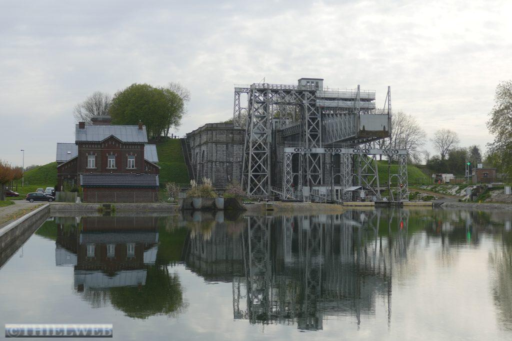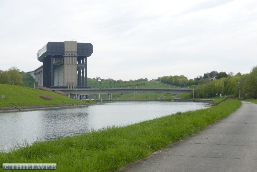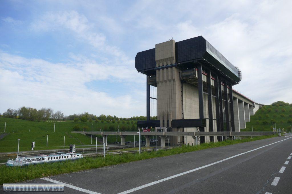 Da auf unserem Parkplatz schon sehr früh jede Menge Autos ankommen, fahren wir beizeiten ab nach Thieu. Hier steht eines der größten Schiffshebewerke der Welt. Im 19. Jahrhundert wurde der Höhenunterschied von 66 m auf 7 km durch 4 hydraulische Schiffshebewerke ausgeglichen. Wir parken am 4. Hebewerk, was schon gewaltig ist. Von Weitem erblicken wir das imposante Gebäude des elektromechanischen Schiffshebewerkes von 2002, das den gewaltigen Höhenunterschied direkt ausgleicht. Nach einem Spaziergang fahren wir weiter über die Grenze nach Frankreich.