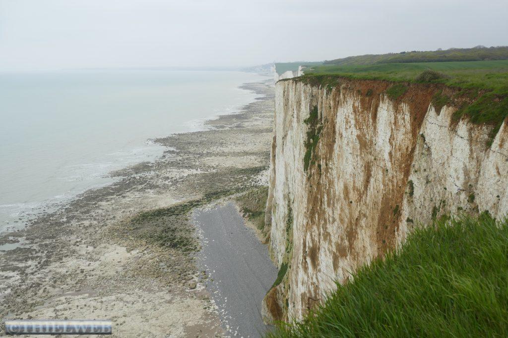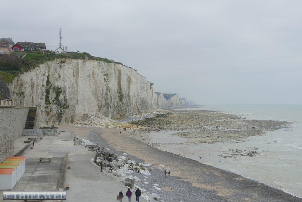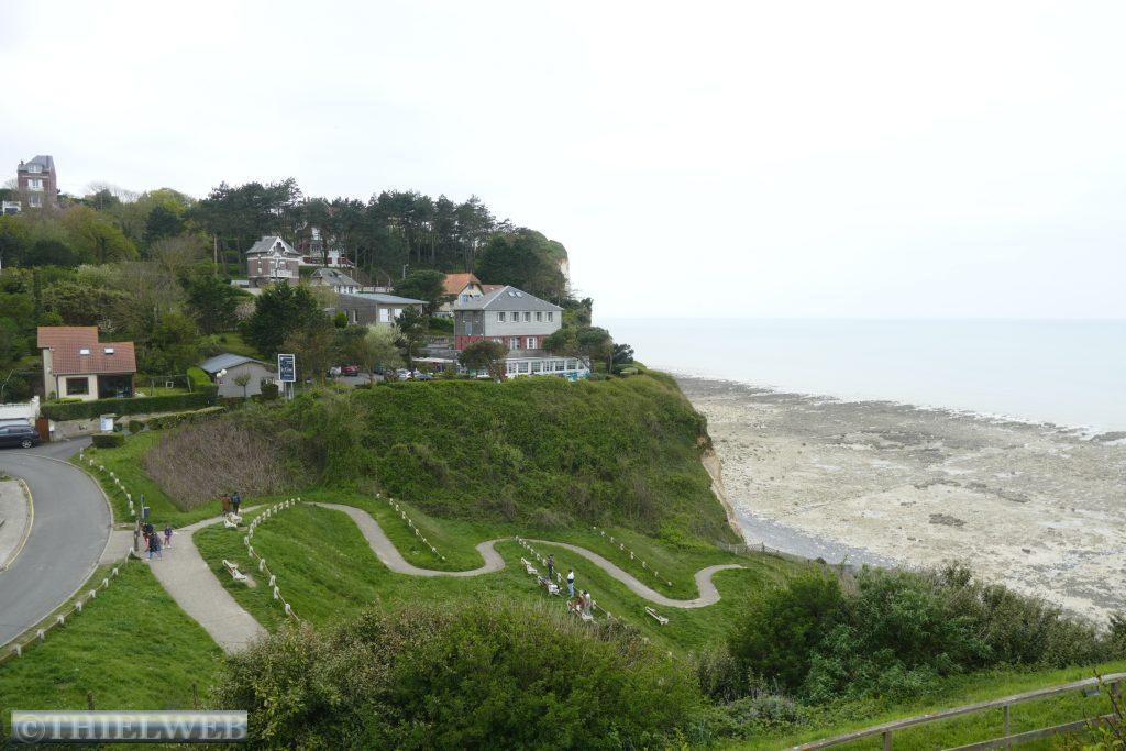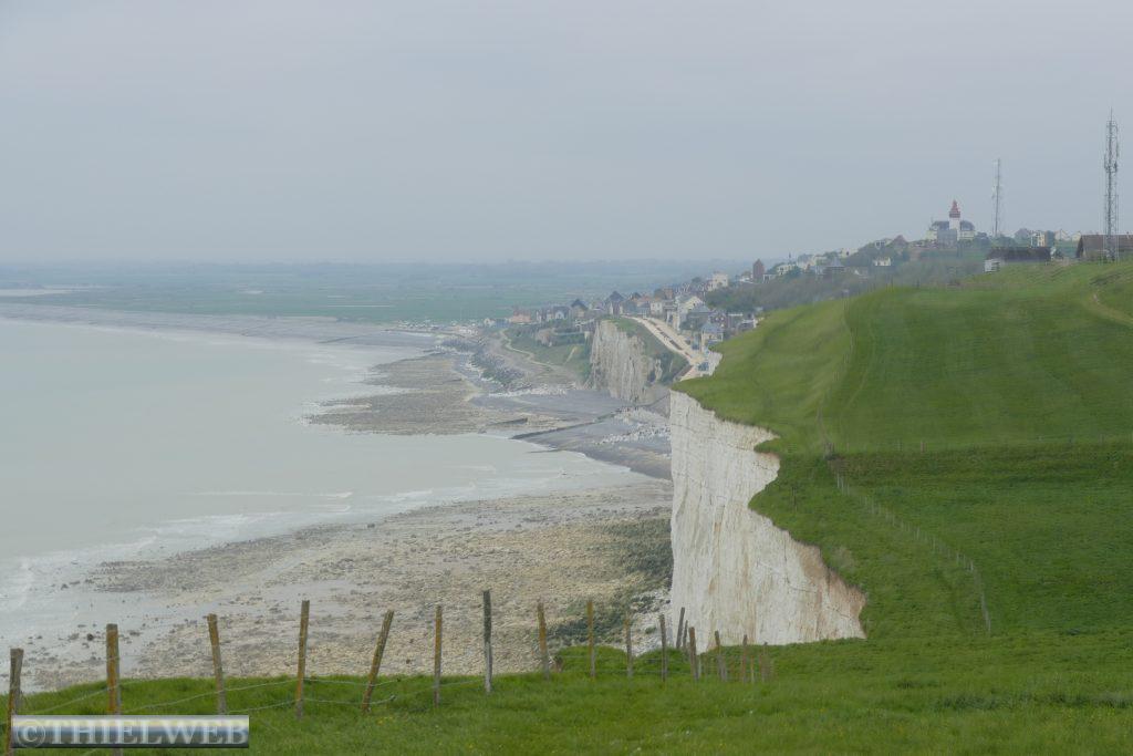 Nach über 1.000 km Autofahrt und Stadtbesichtigungen steht heute mal eine Wanderung an. Über Mers-les-Bains geht es steil hinauf auf den gut markierten Klippenweg. Oben steht die Statue de Notre-Dame de la Faleise als Seezeichen für die Fischer. Über Weiden, deren Zäune wir mittels Gatter oder Treppen überqueren, erreichen wir Bois de Cise, wo wir über Treppen zum Strand und den Klippen hinuntersteigen. Dann ist es noch ein kurzes Stück bis Ault. Vom Balkon am Meer genießen wir die kolossale Umgebung, bevor wir uns auf dem gleichen Weg zurückbegeben.