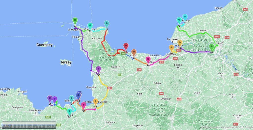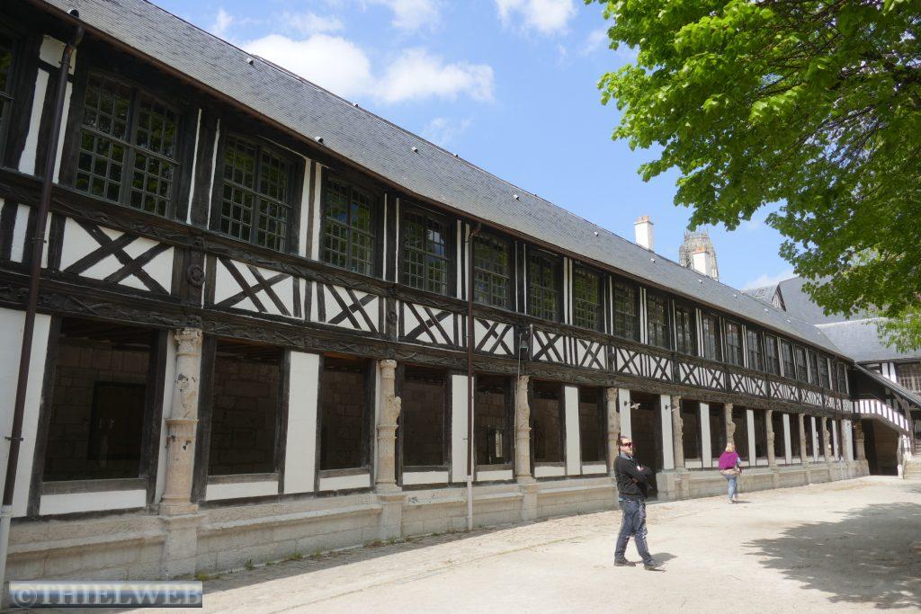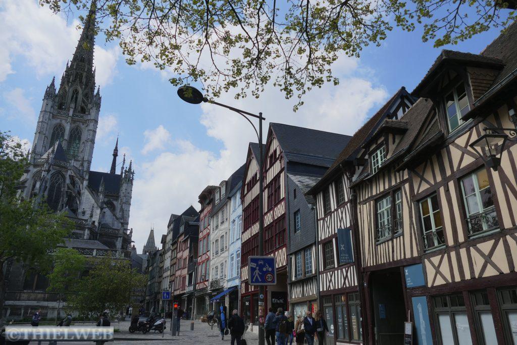 Wir verlassen die Küste und fahren in die historische Hauptstadt der Normandie, nach Rouen. In Sahurs am Fähranleger nach La Bouille und direkt am Seine-Radweg parken wir. Für die ca. 20 km bis in die Innenstadt nehmen wir heute unsere Fahrräder. Kopfsteinpflaster Gassen werden von Fachwerkhäusern gesäumt. Die astronomische Uhr aus dem vierzehnten Jahrhundert, Gros Horloge, ist das Symbol von Rouen. Die 151 m hohe Turmspitze der Kathedrale ist die höchste in Frankreich und die Zweithöchste der Welt nach Köln. Wir gehen noch ein Stück weiter bis zur Kirche Saint-Maclou, wo sich gleich daneben die Aitre Saint-Maclou, der ehemalige Massengrab Friedhof aus dem 16. Jahrhundert befindet. Es ist eines der letzten Nekropolen im Stadtinneren in Europa, das während der Schwarzen Pest im Jahr 1348 entstand. Die Galerien dienten als Beinhäuser.
