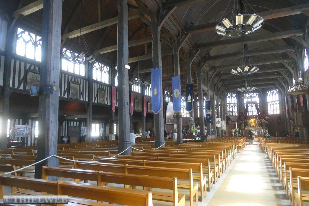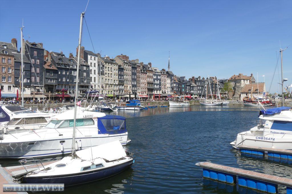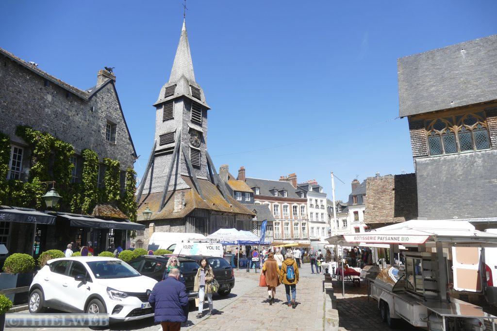 Einer der meistbesuchten Orte im Calvados ist Honfleur und das bemerken wir sofort, als wir durch die Stadt zu unserem Stellplatz wollen. Nun sind auch noch überall Schilder mit Höhenbegrenzung auf 2,30 m. Das hat unser Navi mal wieder nicht gewusst. Also irgendwie umdrehen und zum ca. 3 km entfernten Stellplatz. Hier gefällt es uns sehr gut und wir gehen zu Fuß in die Stadt, da wir in dem Gedränge die Fahrräder nicht schieben möchten. Das Hafenbecken vieux Bassin ist 130 m lang und 70 bis 85 m breit und vollständig von öffentlichen Kais umgeben. Mittelalterliche verschieferte Häuser und Fachwerkhäuser spiegeln sich im Hafenbecken. Einzigartig ist die Kirche Sainte-Catherine, die größte Holzkirche Frankreichs. Ihr Glockenturm wurde in ausreichender Entfernung errichtet, um die Gläubigen im Brandfall zu schützen.