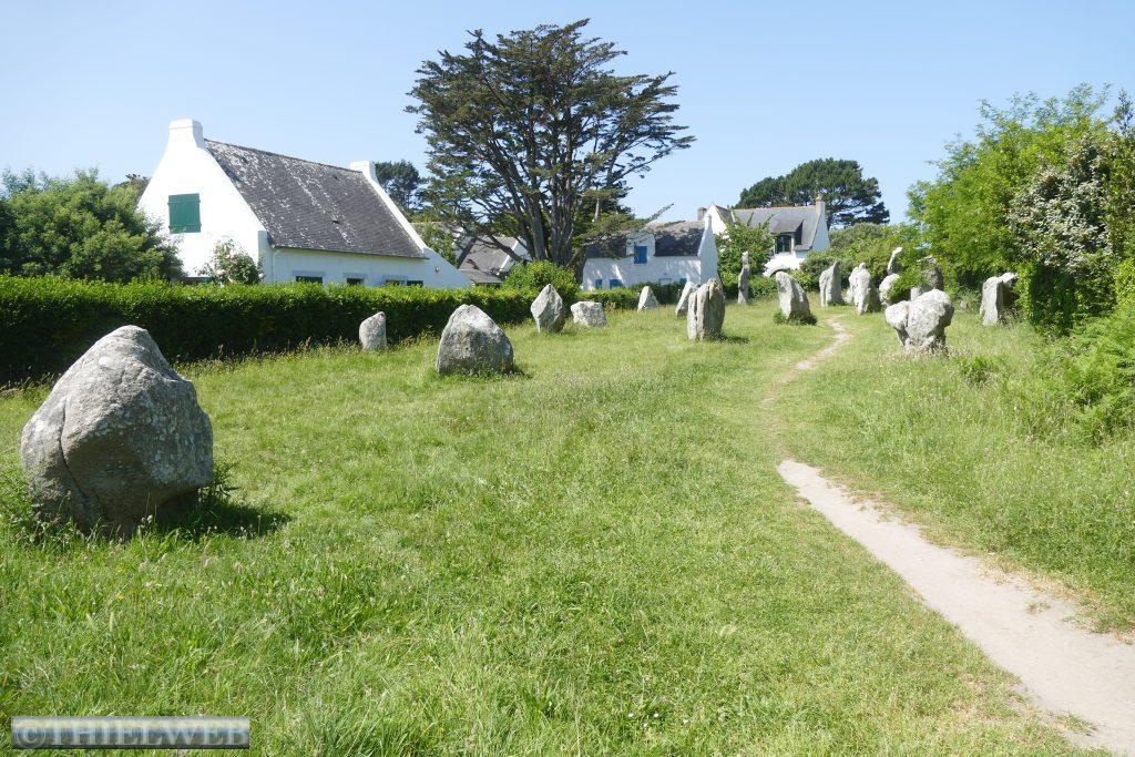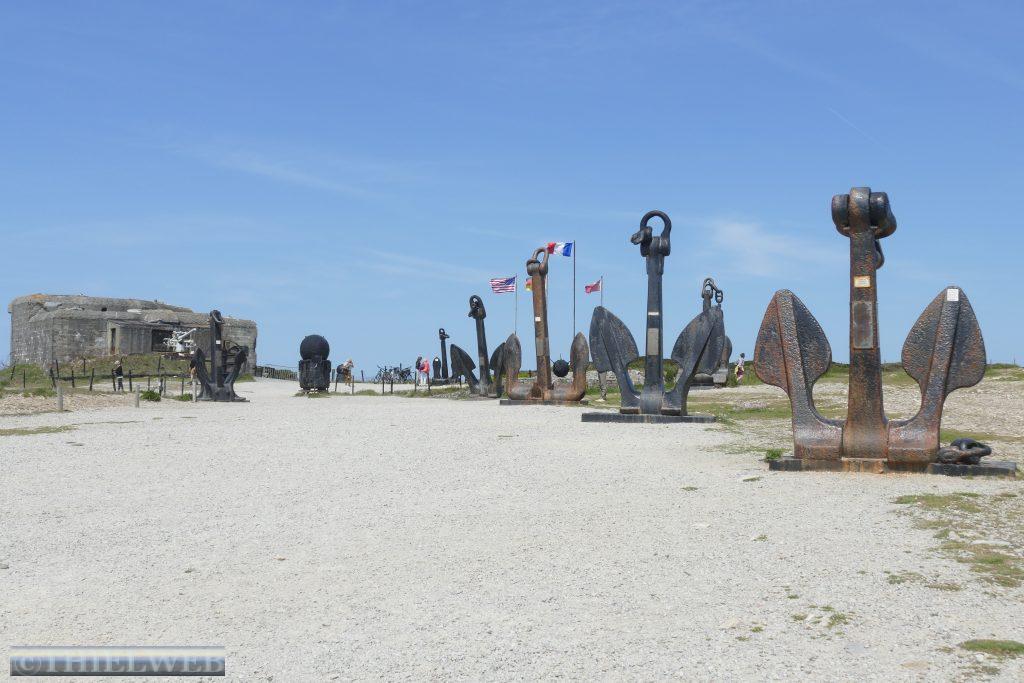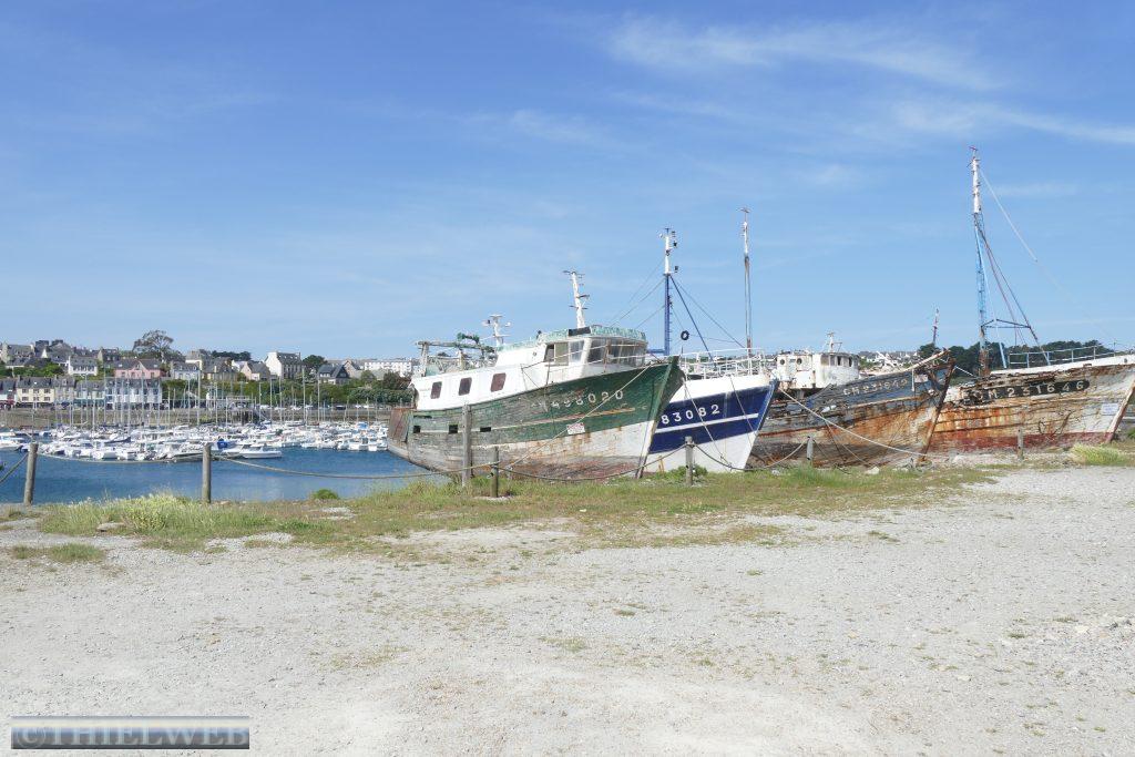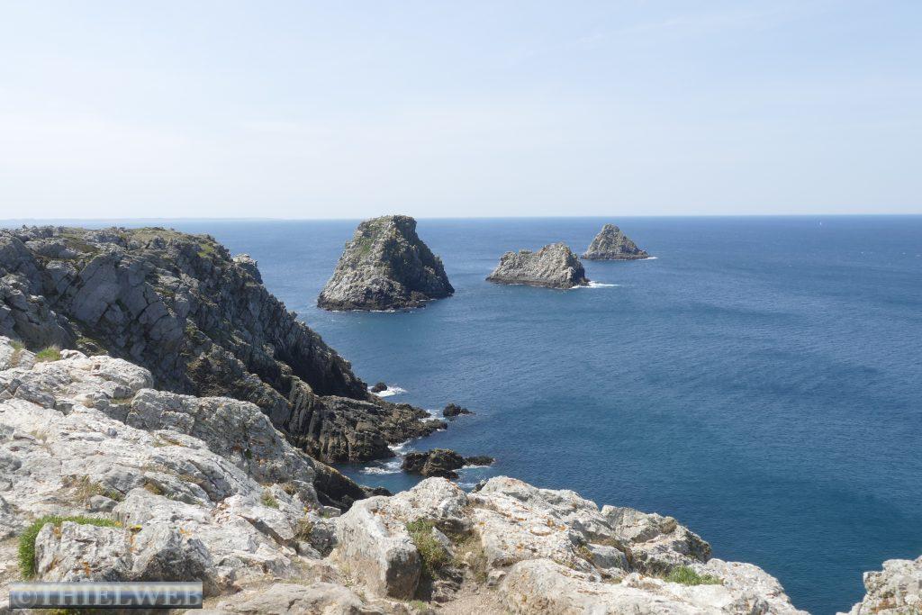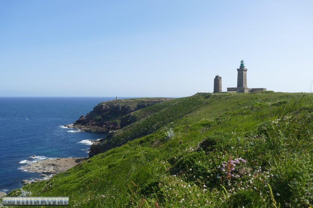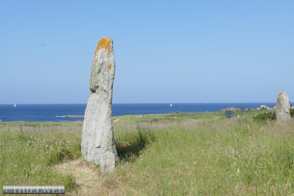 Wir fahren weiter auf die Spitze der Halbinsel nach Camaret-sur Mer und parken direkt an den Steinreihen Alignements de Lagatjar. Die Steinreihen bestehen aus 72 Menhiren. Von hier aus beginnen wir unsere Wanderung zur Pointe du Toulinguet. Wir wandern an den Resten der Verteidigungsanlagen Batteries de Kerbonn, der ersten militärischen Befestigungsanlagen von 1889 bis 1891 vorbei und kommen zum ehemaligen Hafen von Camaret-Sur Mer. Er war früher für den Langustenfang bekannt. Die Schiffe der Fischer verrotten heute auf dem Schiffsfriedhof neben der Kapelle Notre-Dame-de Rocamadour. Der polygonale Tour Vauban wurde 1693 bis 1696 als Festung zwischen Le Sillon und dem Quai Vauban gebaut und steht auf der UNESCO-Weltkulturerbeliste. Wir kämpfen gegen den starken Wind bis wir zur Plattform an der Pointe de Pen Hir mit dem Granit Kreuz Croix de Pen Hir kommen. Ein paar Schritte weiter ragen sechs Felsen aus dem Meer, von denen drei markant sind. Man nennt sie die Tas de Poin auf deutsch etwa Erbsenhaufen oder Erbseninseln. Das Fort Kerbonn war eine Küstenbatterie zwischen 1942 und 1944. Zur Erinnerung an die Atlantikschlacht stehen hier große Anker der versenkten Schiffe. Nach unserer Wanderung fahren wir weiter zum Cap de la Chèvre.