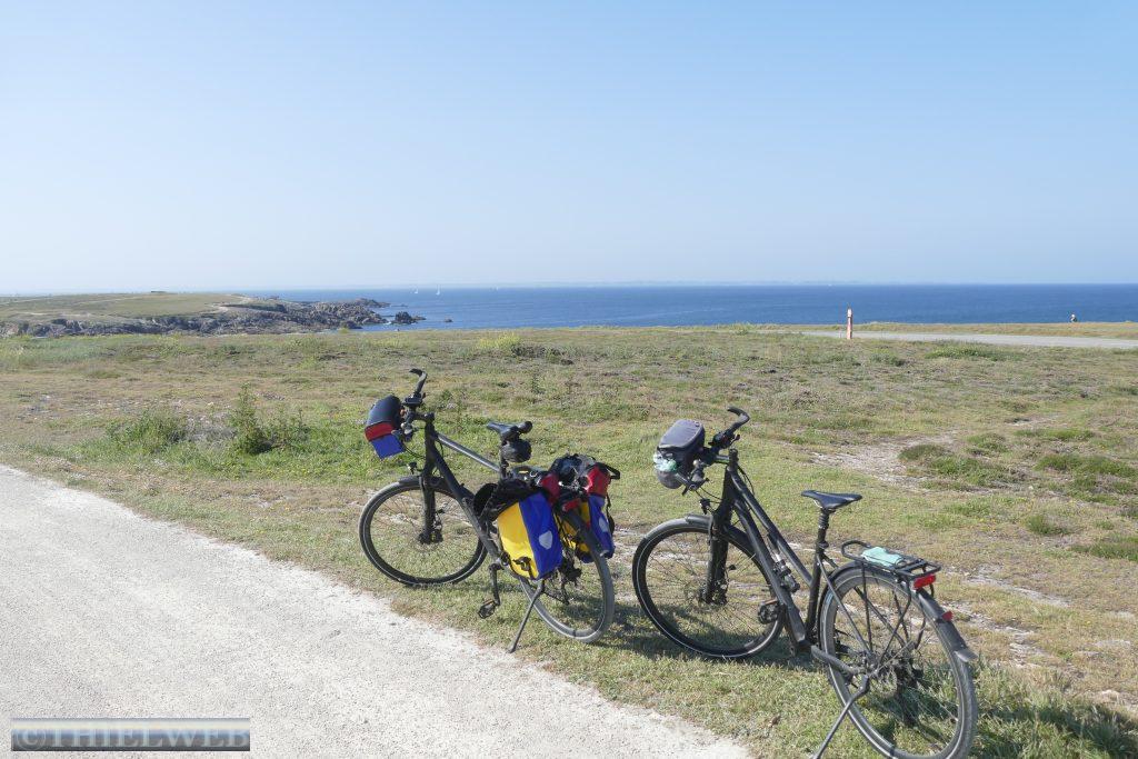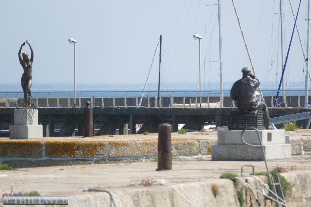 Heute machen wir nun endlich eine Fahrradtour über die Halbinsel Quiberon. Der ausgeschilderte Radweg zum Teil auf Asphalt bzw. Schotter bringt uns um die gesamte Halbinsel herum an schönen feinen Sandstränden vorbei bis zur spektakulären wilden Küste im Westen. Unterwegs kommen wir an Megalith-Standorten vorbei. Am Port Haliguen stehen die Bronzestatuen, die eines Fischers der auf die Meerjungfrau blickt.