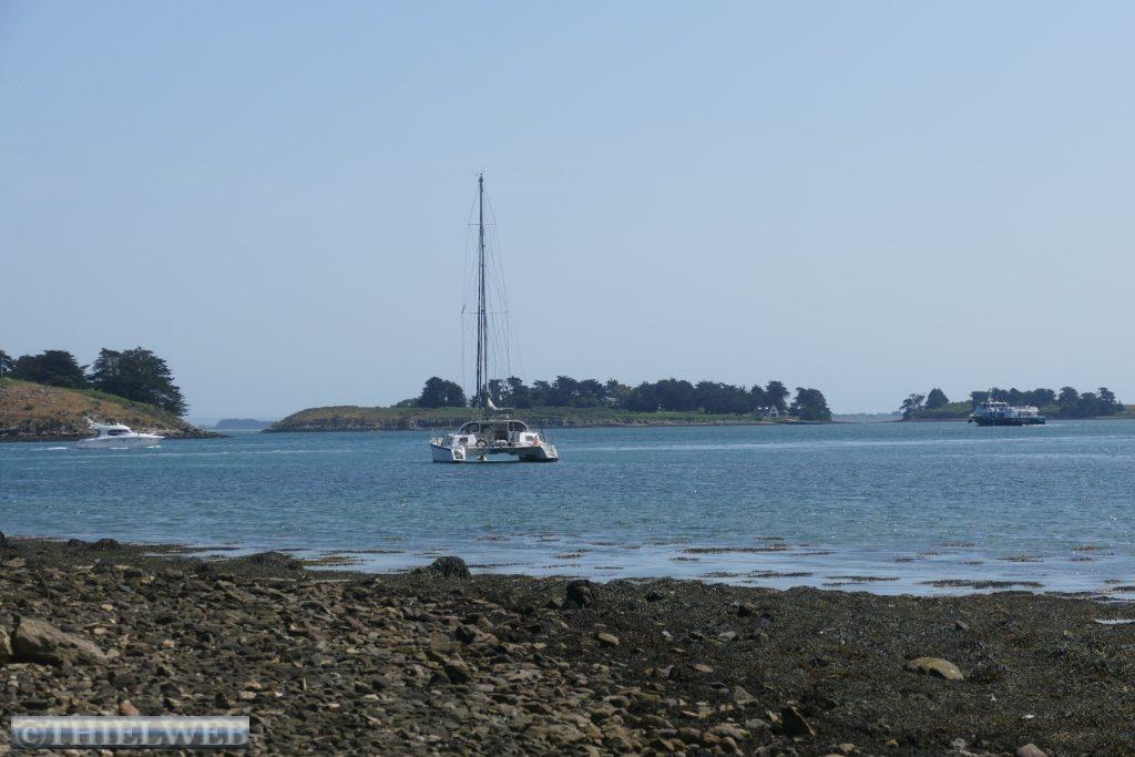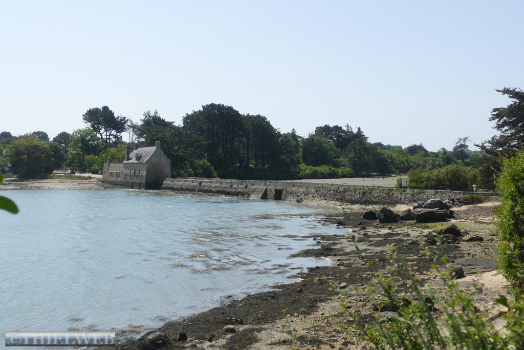 Es war gut, dass wir den Wochentag, an dem auf unserem Parkplatz Parkverbot wegen des Marktes ist, verwechselt haben. Am Morgen bemerken wir, dass an der Straße Stände aufgebaut werden. Oh!? Wir fragen, ob auch auf dem Parkplatz Markt ist. Doch nein, nur an der Straße zur Kirche. Also kein Problem für unsere Wanderung am Golf von Morbihan. Wir beginnen am Port Navalo und folgen dem rot und weiß markierten Wanderweg bis wir am Dolmen bei Bilgoix an der Plage de Treno ankommen. Dann folgen die Pointe Du Monteno, Pointe de Pembert, Pointe de La Paussee und die Pointe de Kerners. Jede Spitze des Gulf Coastal Trail zeigt neue Perspektiven auf einige der berühmten 365 Inseln des Golfs. An der Pen Castel, einer Gezeitenmühle, biegen wir wieder nach Arzon ab. Die Mühle arbeitete früher mit der Gezeitenströmung. Verborgene Ventile im Pflaster sorgten dafür, dass das im Teich zurückgehaltene Wasser über die Räder im Keller des Gebäudes floss. Der Hafen von Arzon, Port deu Crouesta, ist der größte Hafen von Morbihan und gehört zu den bekanntesten Zentren für den Yachtsport in Frankreich. Danach fahren wir weiter ans Meer, nach Sarzeau Le Fort. Unser Stellplatz ist 50 m vom Meer entfernt.