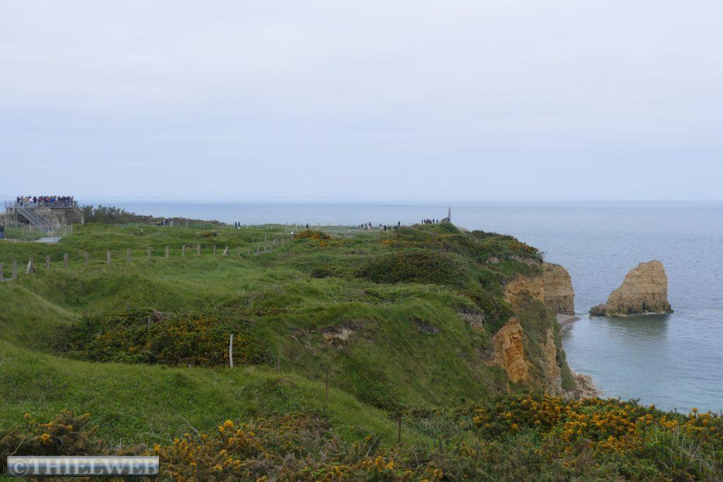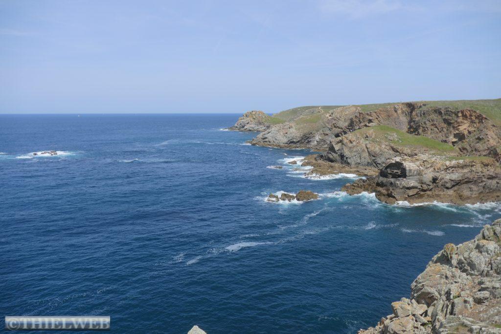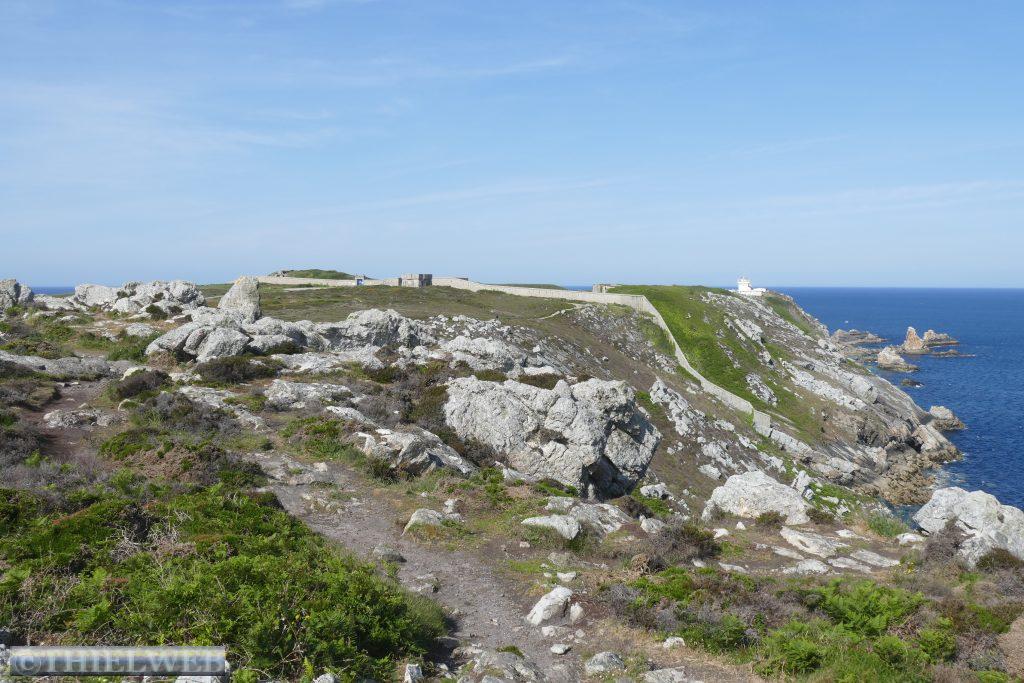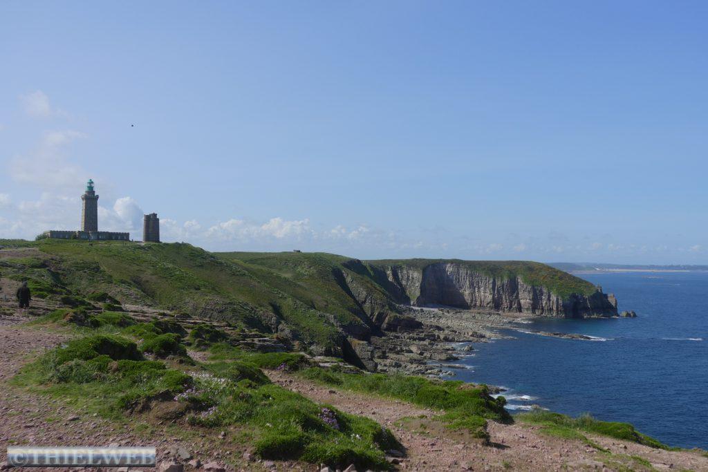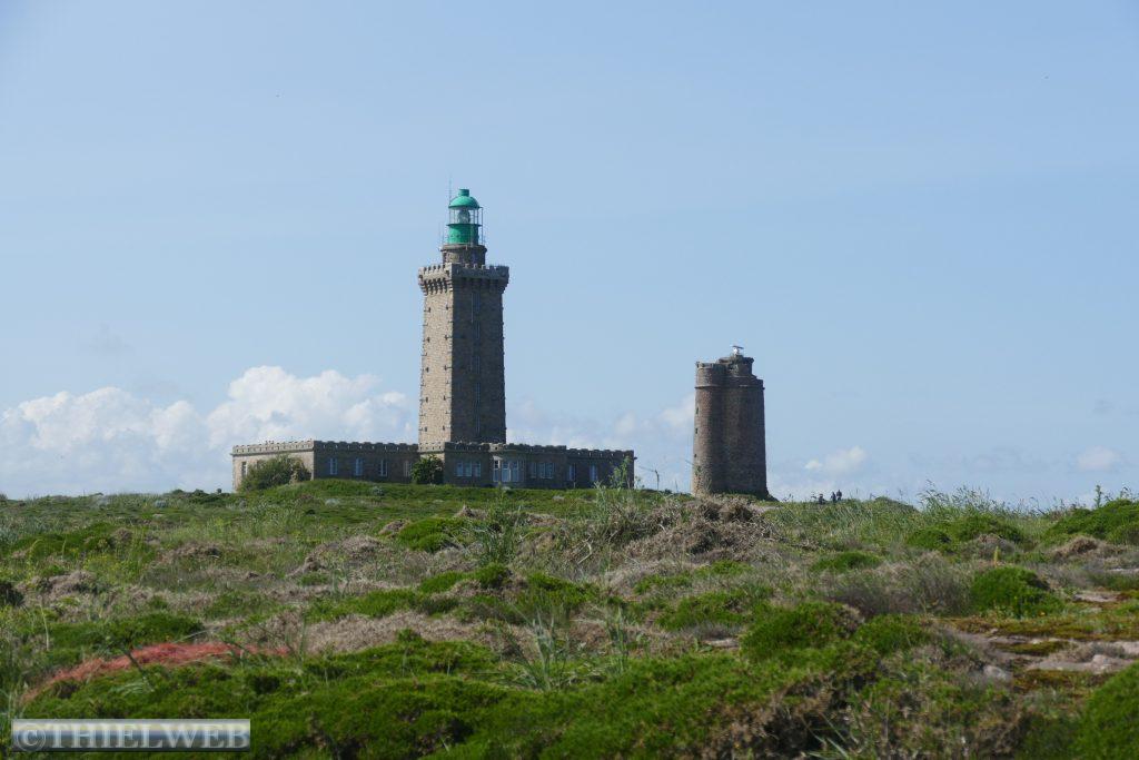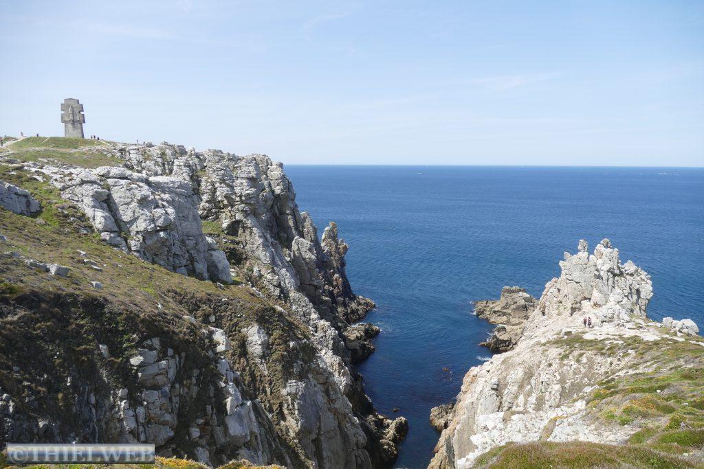 Wir fahren weiter auf die Spitze der Halbinsel nach Camaret-sur Mer und parken direkt an den Steinreihen Alignements de Lagatjar. Die Steinreihen bestehen aus 72 Menhiren. Von hier aus beginnen wir unsere Wanderung zur Pointe du Toulinguet. Wir wandern an den Resten der Verteidigungsanlagen Batteries de Kerbonn, der ersten militärischen Befestigungsanlagen von 1889 bis 1891 vorbei und kommen zum ehemaligen Hafen von Camaret-Sur Mer. Er war früher für den Langustenfang bekannt. Die Schiffe der Fischer verrotten heute auf dem Schiffsfriedhof neben der Kapelle Notre-Dame-de Rocamadour. Der polygonale Tour Vauban wurde 1693 bis 1696 als Festung zwischen Le Sillon und dem Quai Vauban gebaut und steht auf der UNESCO-Weltkulturerbeliste. Wir kämpfen gegen den starken Wind bis wir zur Plattform an der Pointe de Pen Hir mit dem Granit Kreuz Croix de Pen Hir kommen. Ein paar Schritte weiter ragen sechs Felsen aus dem Meer, von denen drei markant sind. Man nennt sie die Tas de Poin auf deutsch etwa Erbsenhaufen oder Erbseninseln. Das Fort Kerbonn war eine Küstenbatterie zwischen 1942 und 1944. Zur Erinnerung an die Atlantikschlacht stehen hier große Anker der versenkten Schiffe. Nach unserer Wanderung fahren wir weiter zum Cap de la Chèvre.