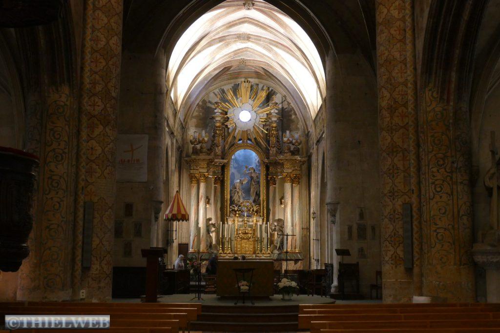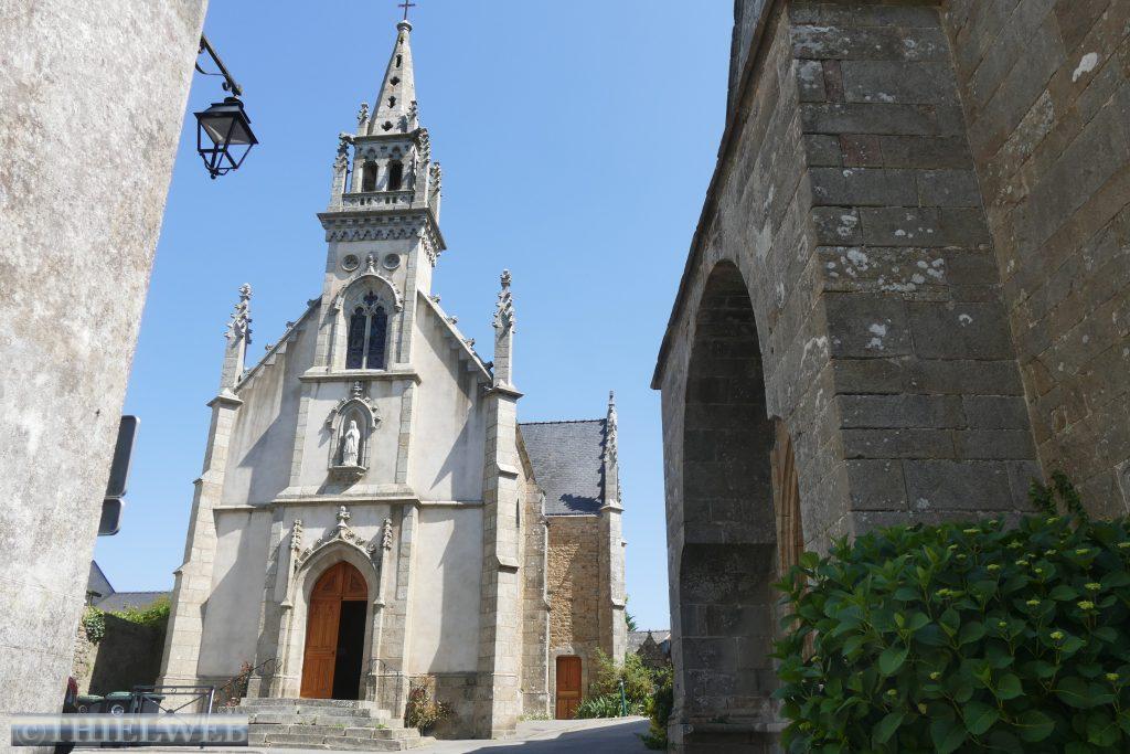 Auf der Weiterfahrt nach Plonévez-Porzay, unserem nächsten Stellplatz mit Entsorgung, halten wir an der Kapelle Sainte-Marie-du Ménez-Horn. Der sehenswerte Pfarrbezirk besteht aus dem Triumphtor, dem Kalvarienberg, Brunnen und der Umfassungsmauer im gleichnamigen Ort. Der Glockenturm, der zwischen 1668 und 1773 erbaut wurde, ist ein Vorbau mit drei Stockwerken und Balustraden, gekrönt von einer Laterne, die denen des Vatikans nachempfunden wurde. Das im Renaissancestil erbaute Kirchenschiff hat auf beiden Seiten Arkaden, die mit Seitenschiffen vergrößert sind.