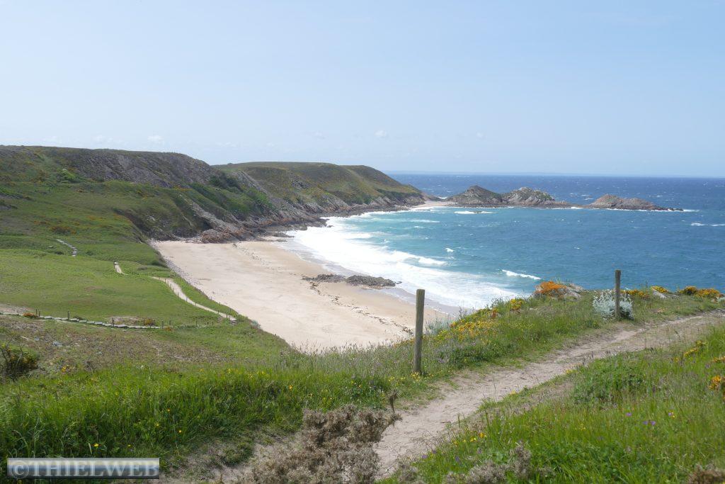 Wir fahren auf das Cap Sizun und parken an der Pointe De Castelmeur. Von hier aus nehmen wir zuerst den landseitigen Weg zur Pointe du Raz mit der Statue Notre-Dame des Neufragé . Der gefährliche Durchgang der Chaussée Raz de Sein wird durch den Leuchtturm Phare de la Vieille gesichert. Ab hier folgen wir wieder dem GR 34 an der aussichtsreichen Steilküste entlang bergauf bergab. Der Weg führt durch Heidelandschaft bis wir einen Badestrand an der Pointe du Van erreichen. Danach kommen an eine kleinen Kapelle bei der Fontaine Saint Mathieu vorbei und im großen Bogen erreichen wir wieder die Pointe De Castelmeur.