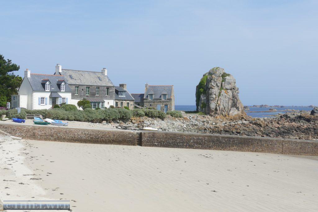 Heute steht das Postkartenmotiv auf dem Programm. Wir fahren auf die Halbinsel Plougrescant und wandern durch ein Mosaik aus Feldern, Heideland und Gehölzen. Die ganze Küste ist mit fantastischen Gesteinsformen übersät. Höhepunkt ist La Maison du Gouffre zu Deutsch das Schlund-Haus. Das kleine Wohnhaus, steht eingeklemmt zwischen zwei riesigen, zerklüfteten Felsen. Im Dorf Plougrescant steht die Kapelle Saint-Gonéry mit seltsam geneigter Bleispitze.
