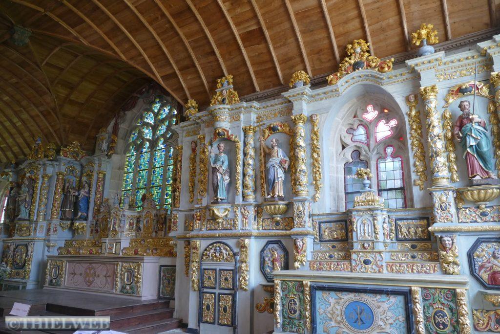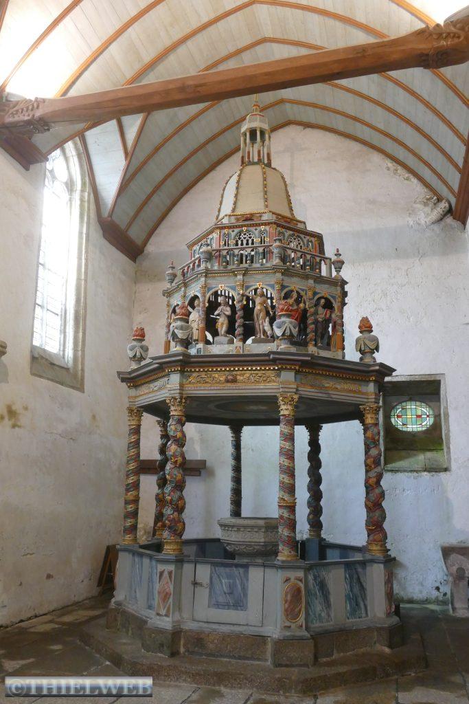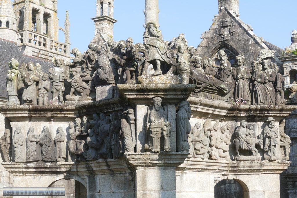 Wir schauen uns heute unterwegs noch zwei weitere Umfriedete Pfarrbezirke an. Die Pfarrkirche von Guimiliau beeindruckt durch Ihren Kalvarienberg, der zwischen 1581 und 1588 erbaut wurde und etwa zweihundert Figuren auf zwei Ebenen darstellt. Ihre Sakristei ist mit einer bemerkenswerten Rotunde geschmückt und verleiht dem Ort eine architektonische Harmonie.