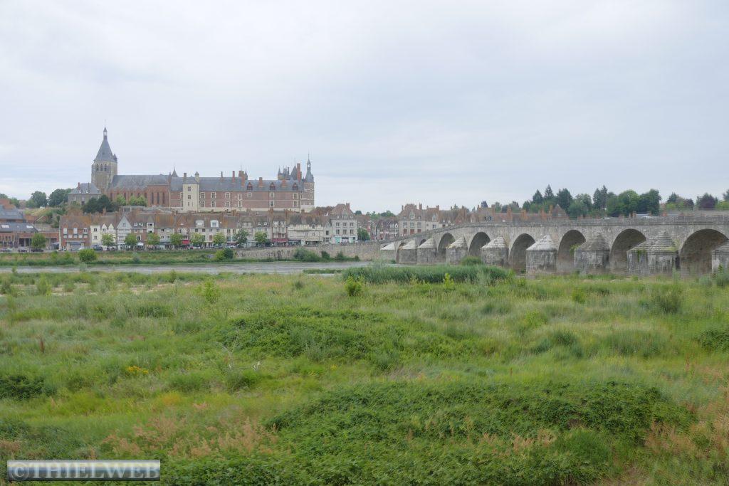 Auf dem Loire-Radweg wollen wir heute nach Briare fahren. Bei der Hinfahrt regnet es ein wenig, doch wir lassen uns nicht abschrecken. Der größte Teil der Strecke geht direkt an der Loire entlang und hat kaum Steigungen. Hauptattraktion ist die Pont-Canal de Briare, eine Kanalbrücke aus Metall, die zwischen 1890 und 1896 erbaut wurde und die Loire in einer riesigen Stufe überspannt, um den Seitenkanal der Loire mit dem Briare-Kanal zu verbinden. Sie ist 660 m lang und 6 m breit und gesäumt von 72 Laternenpfählen und prächtigen Pilastern, die an jedem Ende mit Wappen geschmückt sind. Mittlerweile schafft es die Sonne, sich durchzusetzen. Auf dem Rückweg bestaunen wir noch das Schloss von Gien, aus Backstein und Stein im Hintergrund vor der historischen Steinbrücke „Le Pont et La croix de Saint Nicolas“ über die Loire. In Saint-Godon sehen wir uns die Kirche Saint-Gondon an, die neben dem Priorat steht. Und zu guter Letzt suchen wir in Lion-en-Sullias den seltsamen Stein, der die Kröte genannt wird. Wir fragen eine alte Dame, die uns den Weg sagt. Als wir schon fast aufgeben wollen, sehen wir den Stein hinter Bäumen auf einer Wiese von der Straße aus.