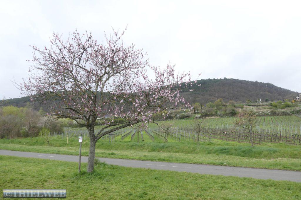 Der Mandelblüten-Panoramaweg in Gimmeldingen ist ein absolutes Muss. Wir fahren am Morgen zum Startpunkt der Wanderung. Durch die klimatisch bevorzugte Lage am Rand des Haardtgebirges gedeihen die Mandelbäume hier besonders gut. Sie stehen überall entlang der Straßen und Wege und in den Weinbergen. Leider sind wir für die rosa Blütenpracht in diesem Jahr eine Woche zu spät. Nur vereinzelt blüht noch ein Baum. Sonne und leichter Regen wechseln sich heute ständig ab. Dazu bläst ein kalter Wind.