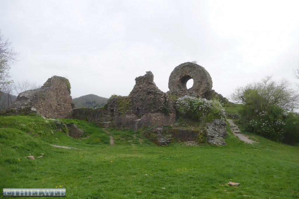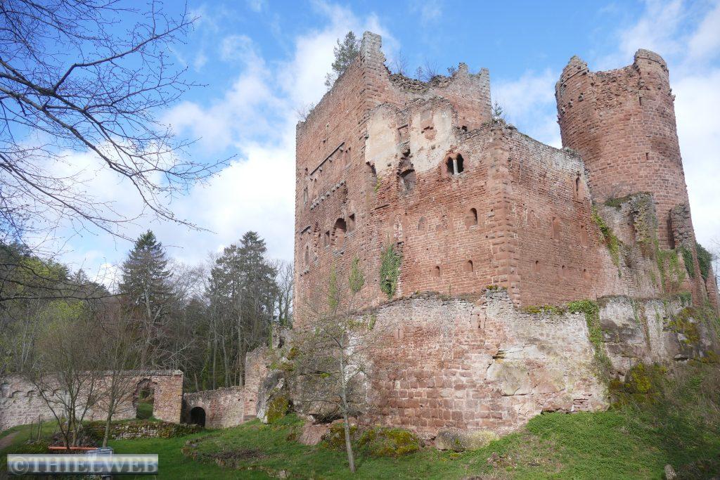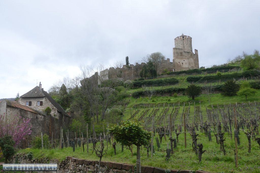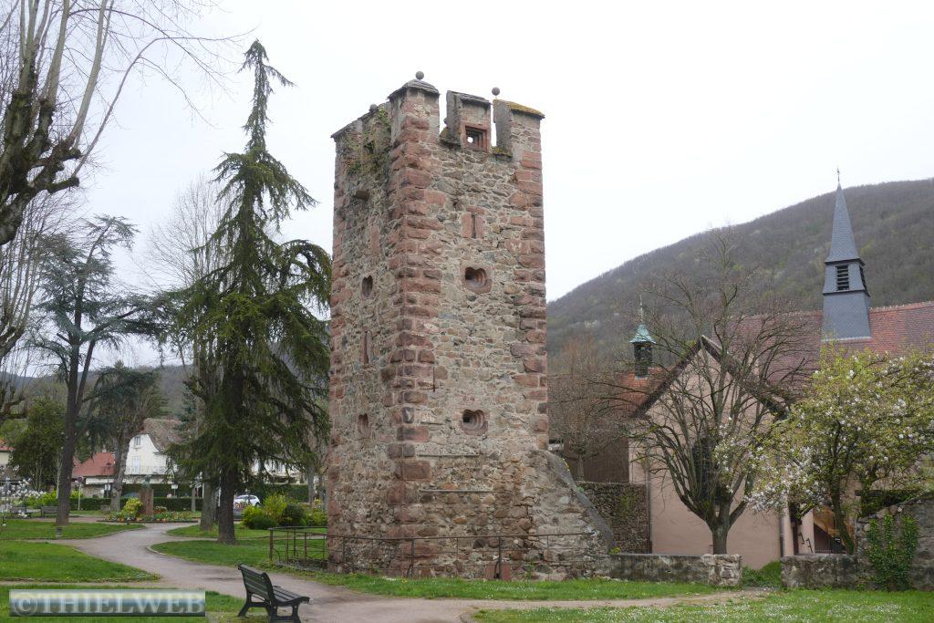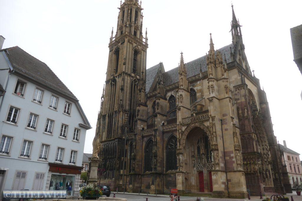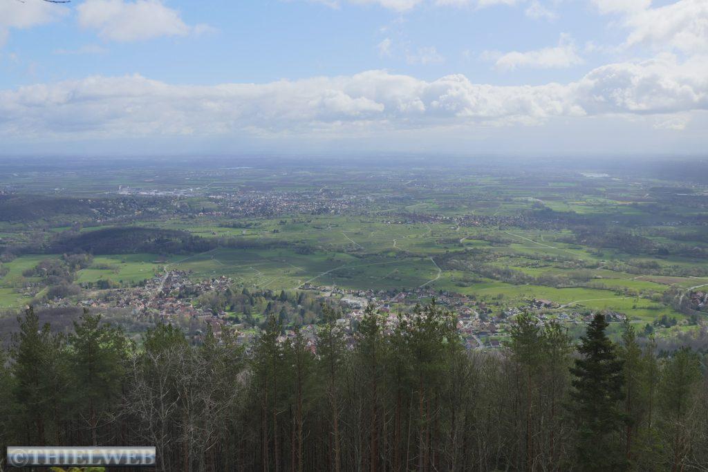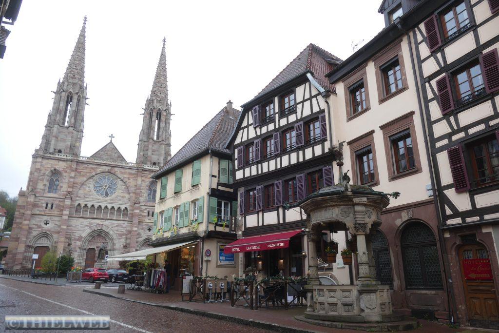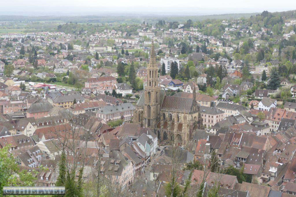 Unser heutiges Ziel ist die von Weinbergen umgebene Stadt Thann am Flüsschen Thur. Das Münster zu Thann gilt als eines der Haupt- und Meisterwerke gotischer Bau- und Ausstattungskunst nach der Straßburger Kathedrale. Das große Portal mit bis 150 Szenen ist einzigartig in Frankreich. Über der Stadt thronen die Ruinen der Burg Engelsburg aus dem 12.-16. Jahrhundert. Bei der Zerstörung auf Befehl Ludwigs XIV. kippte der Bergfried, von dem nur noch ein ringförmiger Stein übrig blieb, dem Hexenauge.