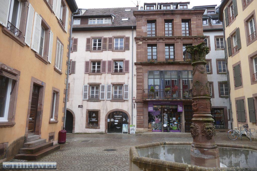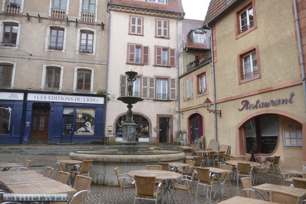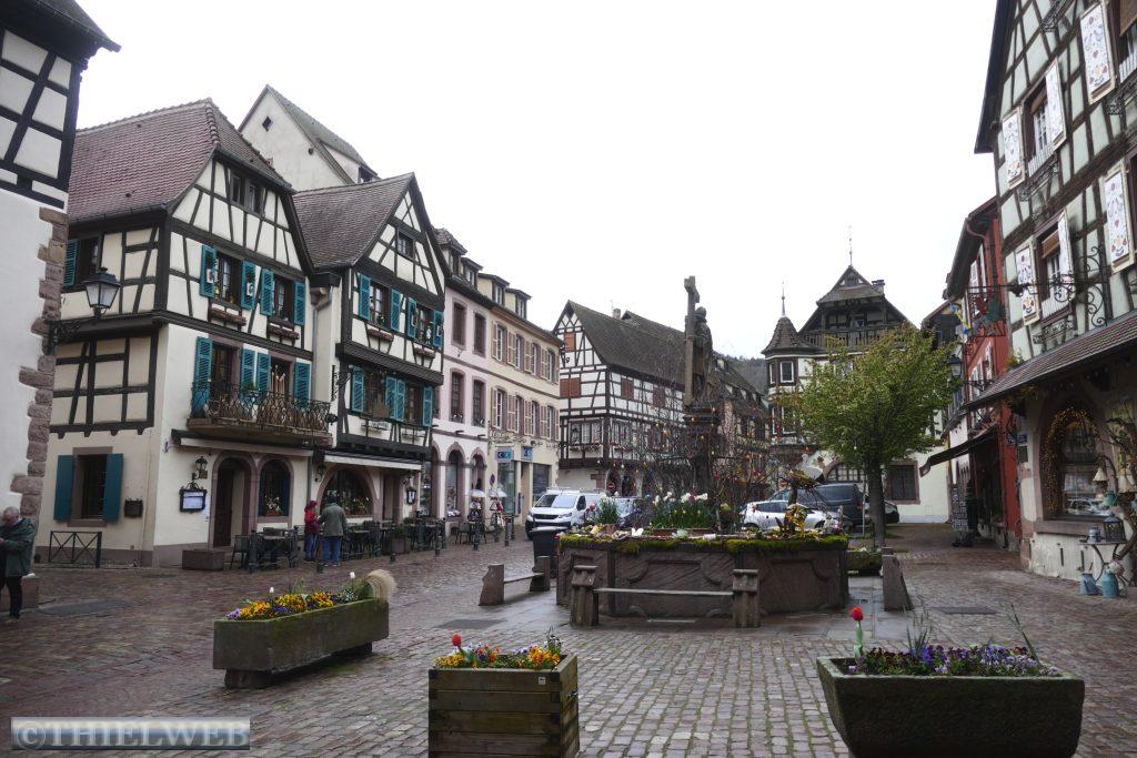 Die ganze Nacht hat es mal wieder geschüttet und es ist kein Ende abzusehen. Wir fahren erst einmal weiter nach Obernai mit seinen mittelalterlichen und Renaissancehäusern in der alten von einer Mauer umgebenen historischen Stadtanlage. Zuerst kommen wir am 60 m hohen Kapellenturm aus dem 13. Jahrhundert vorbei, zum Marktplatz mit dem Odilenbrunnen und dem Rathaus. Ihm gegenüber befindet sich das Kornhaus, an dessen Giebel sich zwei Rinderköpfe und das Stadtwappen befinden. Sehenswert ist auch die Kirche Saints-Pierre-et-Paul aus rosafarbene, grauem und gelbem Sandstein. Ungewöhnlich ist der Sechs-Eimer-Brunnen mit den drei Korinthischen Säulen. Etwas suchen müssen wir, um den Fastingerhof zu finden. Einige Teile stammen aus dem Jahr 1418. Oberhalb des Brunnens befindet sich ein geschnitzter Rinderkopf und Wappen der Fleischer.