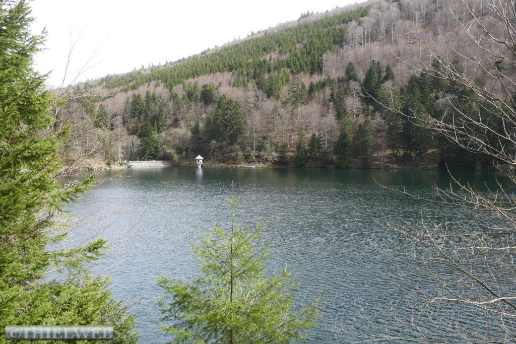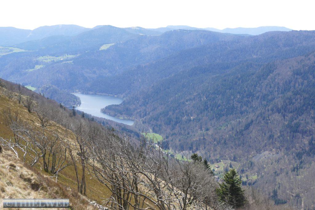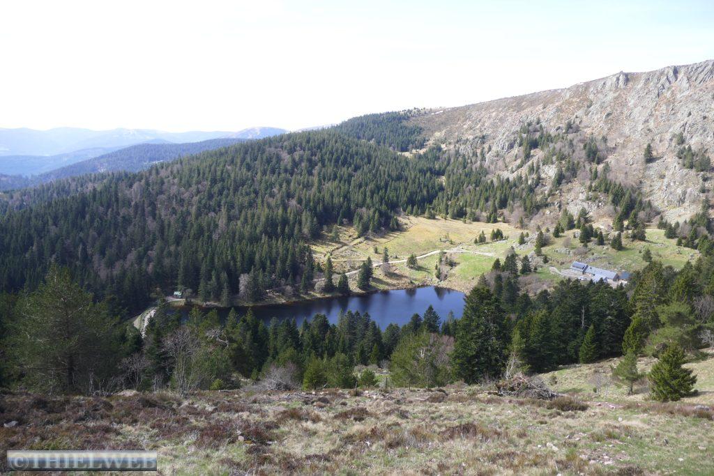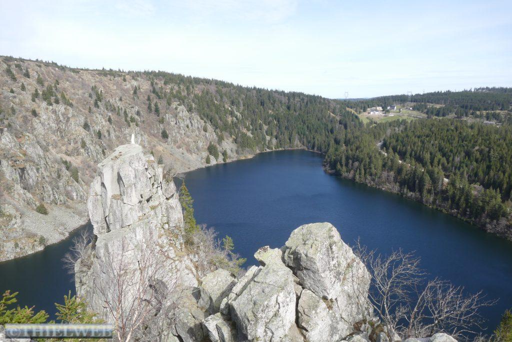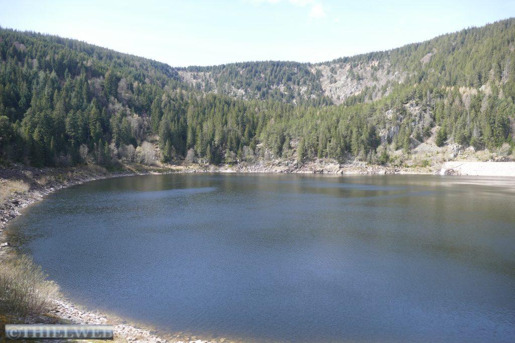 Wir befinden uns jetzt auf der Route de la Cretes, der Vogesenkammstraße. Sie zählt zu den imposantesten und aussichtsreichsten Bergstraßen Frankreichs. Sie verläuft entlang des Hauptkammes der Südvogesen auf fast durchweg 1.200 Höhenmetern und wurde während des Krieges 1914-1918 als Versorgungsstraße angelegt. Auf 75 km verläuft sie vom Col du Bonhomme im Norden über den Col de la Schlucht, Hohneck, Markstein, Grand Ballon und Cernay bis Thann im Süden. Meist entlang von Laub- und Mischwäldern mit herrlichen Ausblicken auf die Vogesen, die Rheinebene und den gegenüberliegenden Schwarzwald. Es hat sich gelohnt, auf besseres Wetter zu warten. Wir fahren bis zum Lac Blanc, wo wir zu unserer Wanderung bei Sonnenschein aufbrechen. Zunächst laufen wir um den Lac Blanc entlang und steigen bergan bis zu einem schönen Ausblick über das Wasser und zur schroffen Karwand. Am Südostende des Sees entscheiden wir uns für den Abstieg zum Rocher Hans. Wir nehmen den Felsenweg der Trittsicherheit erfordert und werden mit einer spektakulären Aussicht über den Lac Blanc und über die Gebirgslandschaft belohnt. Hier drehen wir wieder um und nach kurzer Kraxelei über wild durcheinander gewürfelte Felsblöcke kehren wir zum Abzweig zurück. Dann geht es über eine ausgedehnte Hochmoorlandschaft mit Grasmatten, Heide und niedrigwüchsigen Kiefern. Der kalte Wind bläst uns kräftig entgegen. Bei 1302 m am Gazon du Faing haben wir den höchsten Punkt unserer Wanderung erreicht. Die Aussicht ist grandios, zumal die Hochlagen noch schneebedeckt sind. Wir folgen der Markierung zum Lac du Forlet. Verlief der Weg bislang im Wald, so haben wir nun eine grandiose Sicht nach Süden zum Massiv des Großen Belchen. Mal auf, mal ab über Fels und Wurzeln erreichen wir den Lac Noir. Von hier folgt zuerst ein Forstweg, dann ein kräftiger Aufstieg, bevor wir wieder unseren Ausgangspunkt erreichen.