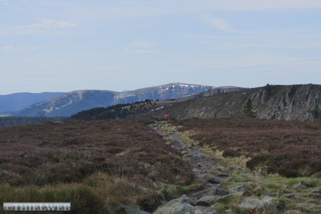 Wir wollen heute den anspruchsvollsten Weg in den Vogesen, den »Felsenweg« (Sentier des Roches) unterhalb des Vogesenkamms, erwandern. Er windet sich an Felswänden entlang und um Felsvorsprünge herum, führt über kleinere Geröllfelder und steigt gelegentlich steil ab. Schwierige Stellen sind mit Drahtseil oder Geländer gesichert. Als wir zum Ausgangspunkt kommen, ist dieser bis 30. April gesperrt. Wir überlegen hin und her, ob wir es doch wagen. Lassen es jedoch am Ende, da wir keine Auskunft erhalten, ob der Weg nach dem Winter frei ist. Stattdessen beschließen wir auf den Hohneck Gipfel, dem dritthöchsten Berg der Vogesen (1363 m) zu wandern. Ein breiter steiniger Weg führt aufwärts bis zur Ferme Auberge Trois Fours mit schöner Aussicht auf die Martinswand. Wir haben schon an Höhe gewonnen und es bläst uns ein kräftiger Wind entgegen. Auf dem Gipfel können wir es nur kurze Zeit aushalten. Wir steigen wieder ab und sehen ein Schneefeld, der unseren ursprünglichen Weg versperrt. Kurz bevor wir die Auberge Trois Fours wieder erreichen, sehen wir ein Wanderschild zum Sentier des Roches. Ein zweiter Versuch, hier etwas tiefer über einen schönen Waldweg einzusteigen. Unterwegs treffen wir eine Schulklasse, von deren Lehrer wir abermals die Auskunft erhalten, dass der Weg gesperrt ist. Also Umkehren.