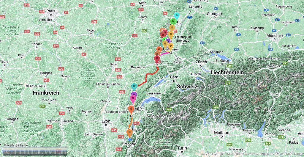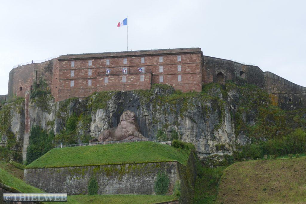 Waren es gestern noch 27° C und am Morgen 14° C, so sind es am Mittag nur noch sehr frische 7° C und es regnet mal wieder. Wir fahren nach Belfort, die Stadt, die durch ihren Widerstand gegen Preußen und die deutsche Annexion ab 1870 geprägt ist. Als strategisch wichtige Verteidigungsstadt hat Belfort seine als uneinnehmbar geltende Zitadelle und ihre Befestigungsmauern bewahrt. Am Fuß der Zitadelle thront der berühmt 11 m hohe aus rosa Sandstein gehauene Löwe. Durch das Tor Brisach, das auf dem Frontgiebel mit den königlichen Symbolen, der bourbonischen Lilie und dem Wahlspruch Königs Ludwig XIV. geschmückt ist, gehen wir Richtung Altstadt. In der Kathedrale St. Christophe befindet sich die monumentale Orgel. Wir suchen noch den Place de la petite Fontaine, ein Brunnen mit den Wappen Belforts und des Österreichischen doppelköpfigen Adlers und den Place de la Grande Fontaine, wo früher der Fischmarkt stattfand. Das Territorium von Beflort ist die Burgundischen Pforte, ein Durchgangskorridor zwischen den Vogesen und dem französische Jura, aber auch eine natürliche Übergangszone zwischen der Elsässischen Ebene und dem Rhône-Tal.