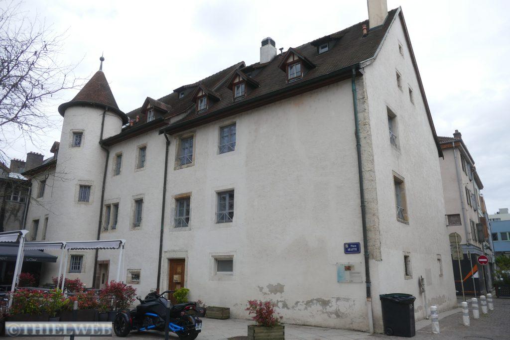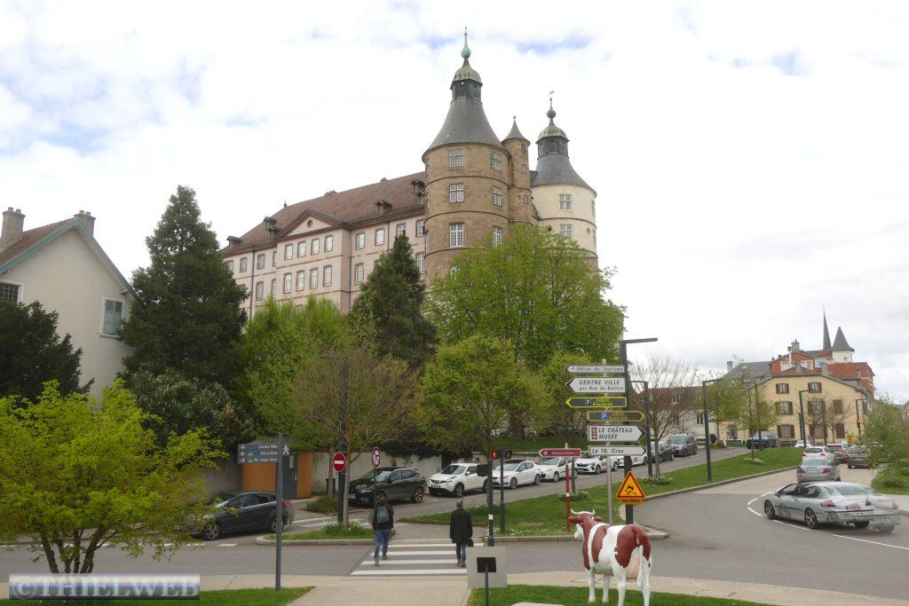 Weiter geht es bei Sonnenschein Richtung Süden nach Montbéliard. Nachdem wir bei Intersport statt eines neuen Uhrenarmbandes für Achim uns im Sonderangebot leichte Wanderschuhe gekauft haben, erreichen wir nach ca. 20 km unser Ziel. Im Zentrum können wir in einem Uhrengeschäft das kaputte Armband ersetzen. Dann geht es zum Touristenbüro. Mit Informationen versehen laufen wir den Stadtrundgang ab, der dem Sentier Heinrich Schickhardt folgt. Hauptattraktion ist das Schloss der Herzöge von Württemberg, die hier mehr als acht Jahrhunderte herrschten. Die Kirche Saint-Maimboeuf wurde gebaut, als Zeichen des aufstrebenden Katholizismus in einer protestantischen Stadt. Am Saint-Martin-Platz befindet sich die älteste protestantische Kirche von Frankreich. Montbéliard gehörte ursprünglich zu Deutschland mit protestantischem Glauben. Erst 1793 wurde die Stadt französisch. Da sie an der Rhein-Rhône-Achse liegt, wechselte sie mehrmals das Departement, bevor sie 1816 endgültig an den Doubs angeschlossen wurde.