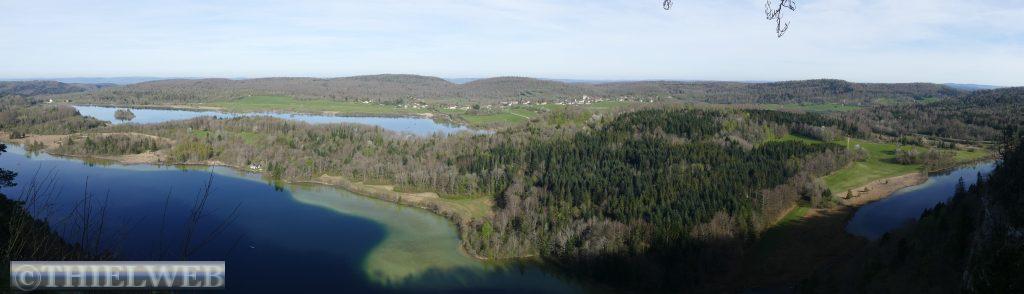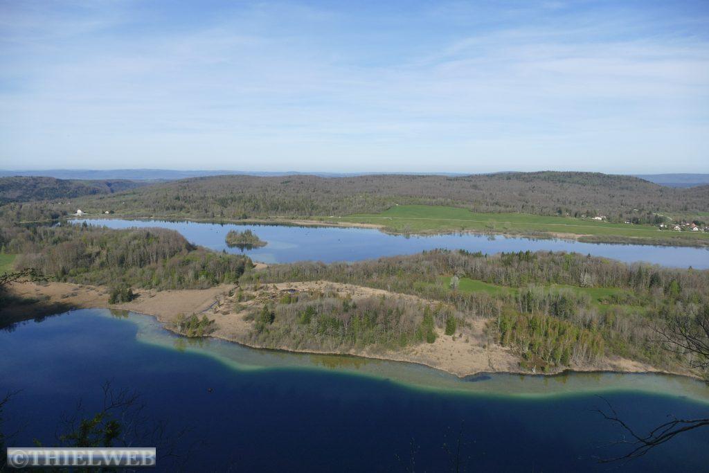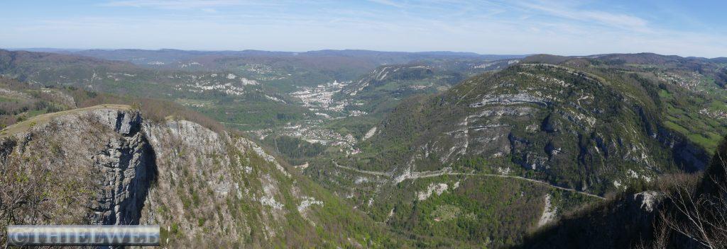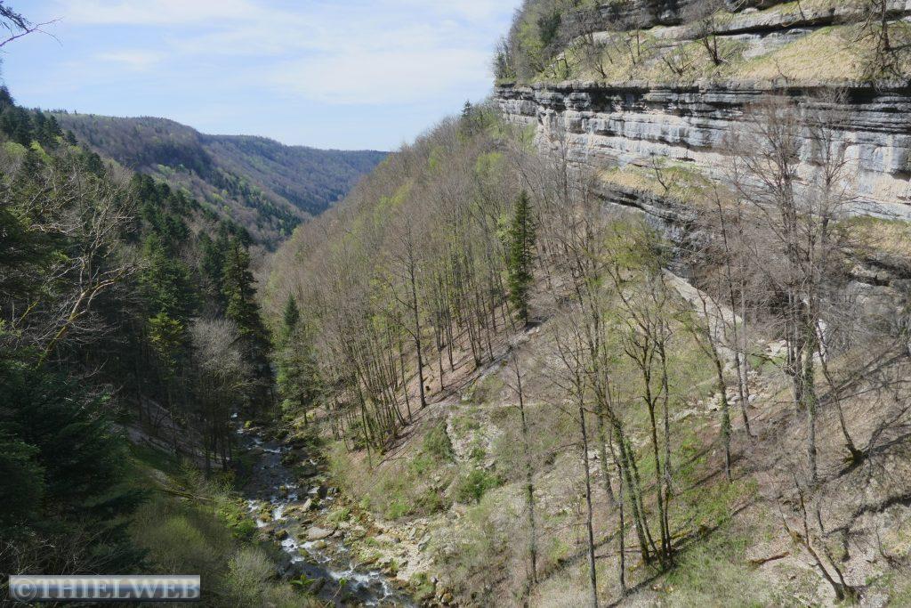 Nach einer ruhigen Nacht fahren wir noch ein paar Kilometer bis Montbrilland, wo unser Wanderweg beginnt. Zuerst laufen wir durch die Gorges du Flumen zu den Wasserfällen, die in den dunklen, wilden und unberührten Talkessel stürzen. Der erste etwas kleinere ist der Wasserfall des Wildbaches Flumen. Der andere auf der rechten Seite wird vom Wasser des Lamoura-Sees gespeist. Wir müssen wieder ein Stück zurück, wo der steile, zuerst in Serpentinen dann geradewegs scheinbar nicht enden wollende Aufstieg über 2,5 km von 440 m zum 1140 m hohen Aussichtspunkt Roche Blanche aufsteigt. Danach erfolgt ein nicht weniger anstrengender Abstieg. Zuerst auf einem schönen Waldweg, dann müssen wir ein Stück Asphaltstraße laufen, von der ein kleiner steiler Weg abzweigt. Dieser scheint erst in jüngster Zeit erneuert worden zu sein und der Jurasplitt rollt auf dem abschüssigen Weg unter den Füßen weg. Mittlerweile sind es wieder sommerliche 28° C und wir kommen ganz schön ins Schwitzen.