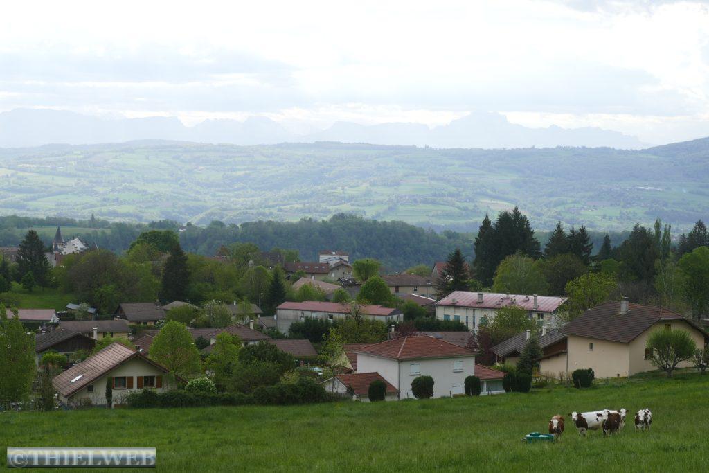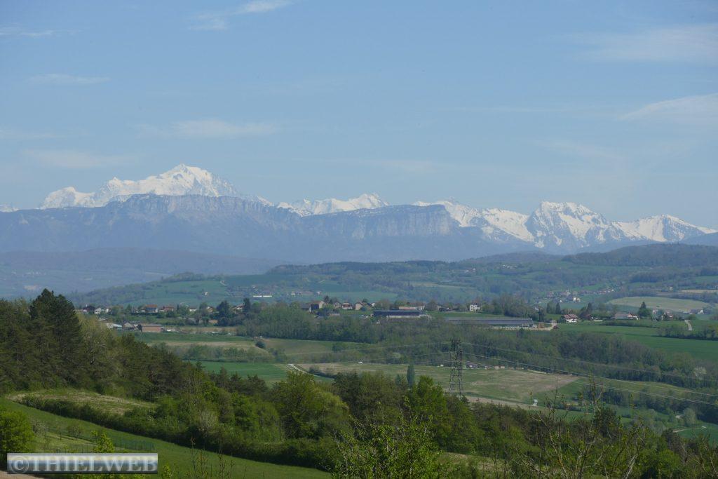 Da wir von Chanay die Berge der Schweizer Alpen so gut sehen, beschließen wir, die kleine Wanderung Le sentier des Charbonniers zu unternehmen. Der Wanderweg verläuft durch Buchenwald, an Wiesen mit Himmelschlüsselchen und vereinzelt an umgewandelten Bauernhöfen zu Wochenendhäusern vorbei. Bedrohlich dunkle Wolken ziehen auf. Unterwegs gibt der Wald die Aussicht auf die Michaille und den Jura. Leider ist heute die Aussicht nicht so klar auf das Mont-Blanc-Massiv. Am Schild „Retour Chanay“ biegen wir ab und kommen über einen steil absteigenden Weg zum Dorf zurück.