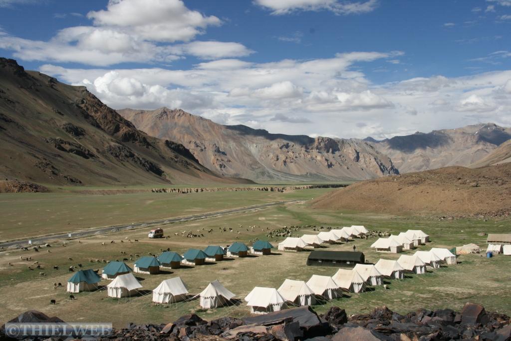 Am Morgen verlassen wir Keylong und erreichen in den Nachmittagsstunden unser Zeltcamp Sarchu, südwestlich von Leh auf einer Höhe von ca. 4.200 m gelegen. Die Aussicht auf der Fahrt dorthin ist einfach fantastisch: schneebedeckte Bergketten, grüne Tannen und mit bunten Gebetsfahnen gesäumte Wege. Aufgrund des harten Winters sind einige Regionen, so auch das Camp von Sarchu, nur in den Sommermonaten zu bereisen. Die Zelte sind für uns dort aufgebaut, und für die Verpflegung ist auch gesorgt. Außerdem sind Waschbecken und Toiletten vorhanden, allerdings gibt es dort nur kaltes Wasser. Das Camp besitzt auch ein eigenes kleines Restaurantzelt, in dem für uns einfache Mahlzeiten und Tee zubereitet werden.