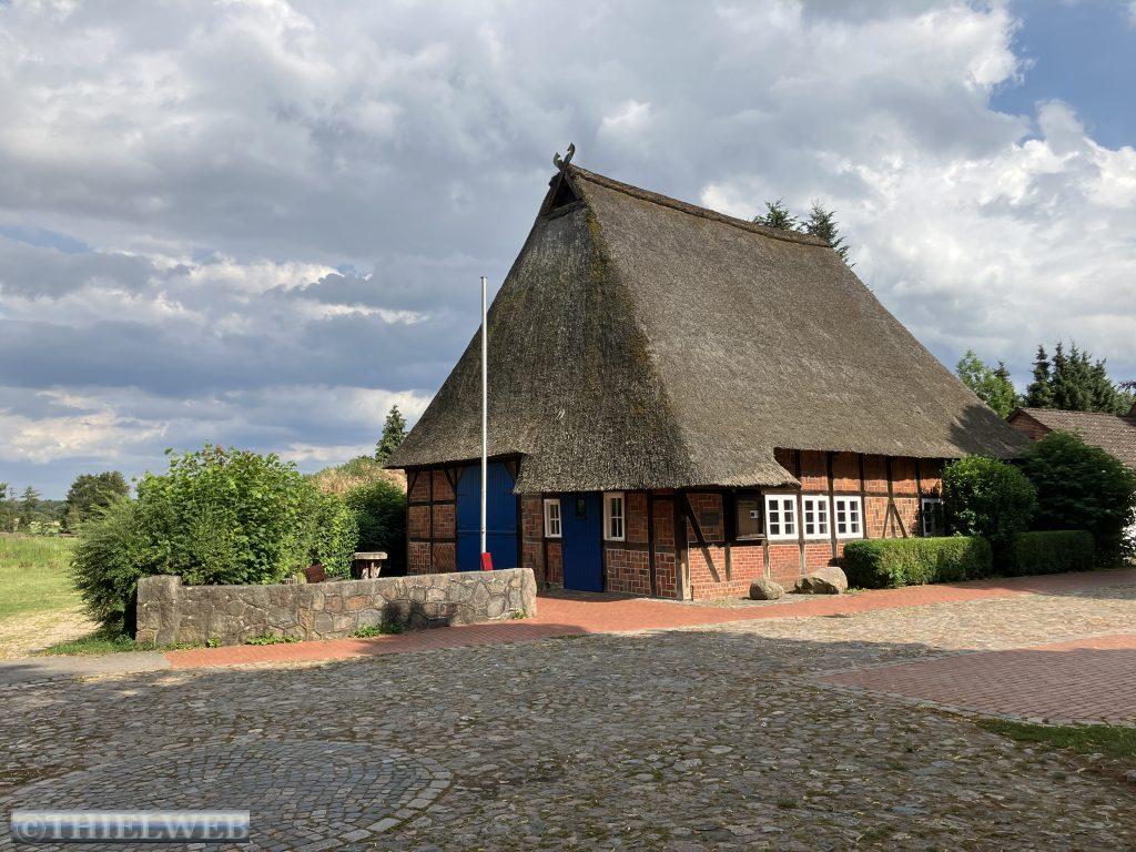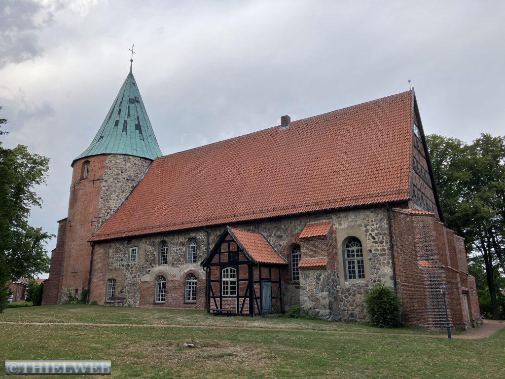 Wir starten zu unserer Reise nach Norwegen kurz vor 9 Uhr, da wir noch zu einer Firma in Erfurt wollen, um zu prüfen, ob wir uns eine LPG-Gastankflasche einbauen lassen könne. Auf der Autobahn ist erstaunlicherweise nicht allzu viel los, doch streckt sich die Fahrt über die Harzautobahn. Nach knapp 400 km nehmen wir unseren geplanten Stellplatz in Salzhausen, einem kleinen Ort am nordöstlichen Rand der Lüneburger Heide. Wir vertreten uns noch ein wenig die Beine und sehen uns die St. Johannis Kirche sowie das hübsche Haus Dörpschün, was so viel heißt wie Dorfscheune, und zu einem Heidehof gehört, an. Eine beeindruckend dunkle Wolke zieht heran, und wir beeilen uns zum Wohnmobil zurückzukehren, bevor sich die Wolke entlädt.