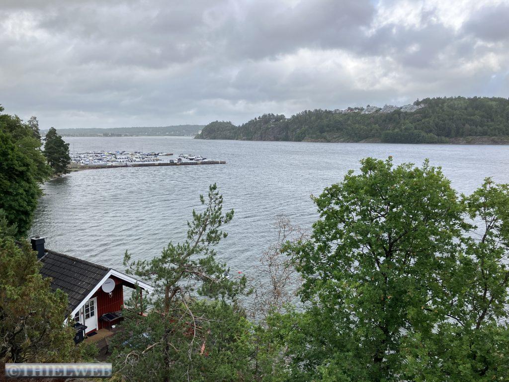Über Göteborg fahren wir weiter in Richtung Norden. Bevor wir die Grenze passieren, tanken wir nochmal voll, was sich im Nachhinein als unnötig erweist, da die Dieselpreise in Norwegen zwar sehr unterschiedlich sind, jedoch etwas günstiger. Wir passieren Oslo, wo die Autobahn Nr. 6 durch unendlich lange und viele Tunnel führt. Dann wechseln wir auf die Autobahn Nummer 18, die in südlicher Richtung weiterführt. In Oslo hat es angefangen zu regnen und so beschließen wir noch ein wenig weiterzufahren. Wir landen nach 460 km in Vear in der Nähe von Tønsberg. Die Navigation zum Stellplatz gestaltet sich recht abenteuerlich auf einer schmalen, kurvenreichen Straße durch eine Wochenendsiedlung. An der Schranke hätten wir schon stutzig werden müssen, doch wir fahren tapfer weiter, bis die Straße in einem schmalen Fußweg endet. Dahinter sehen wir unseren Stellplatz für die Nacht. Also umkehren und von der anderen Seite anfahren. Der Platz liegt mitten in der Natur, mit einem Aussichtspunkt auf den Fjord. Unten am Wasser befindet sich ein Grillplatz. Schade, dass das Wetter gerade nicht mitspielt.