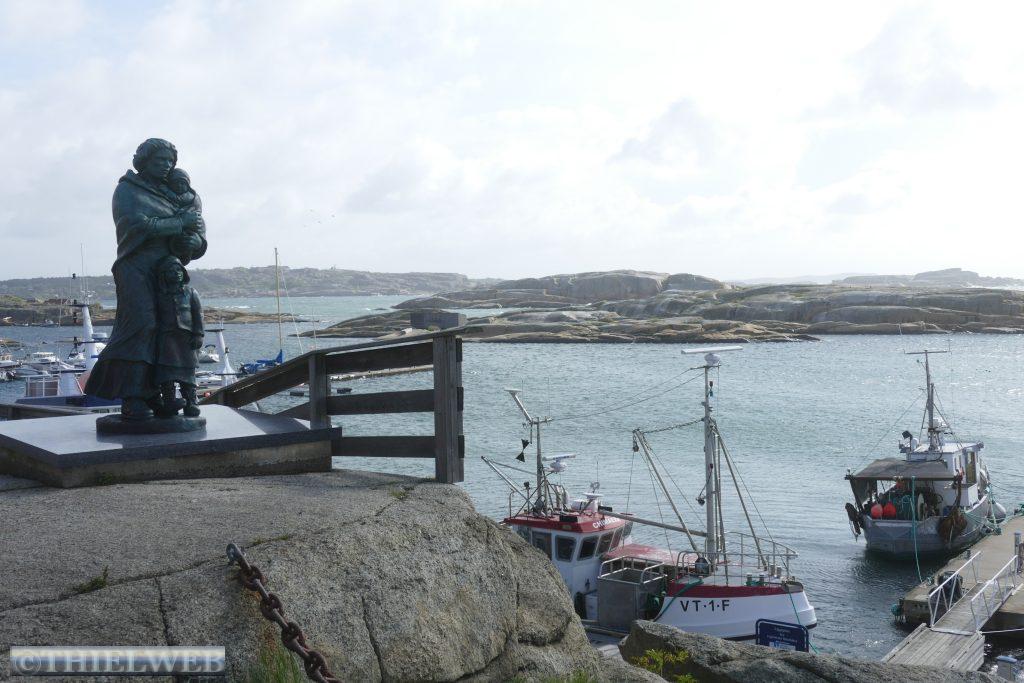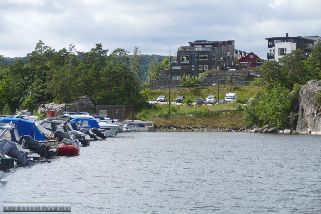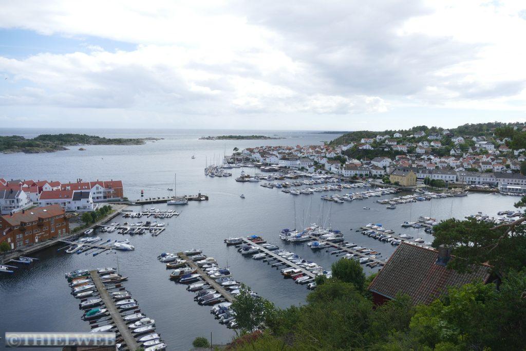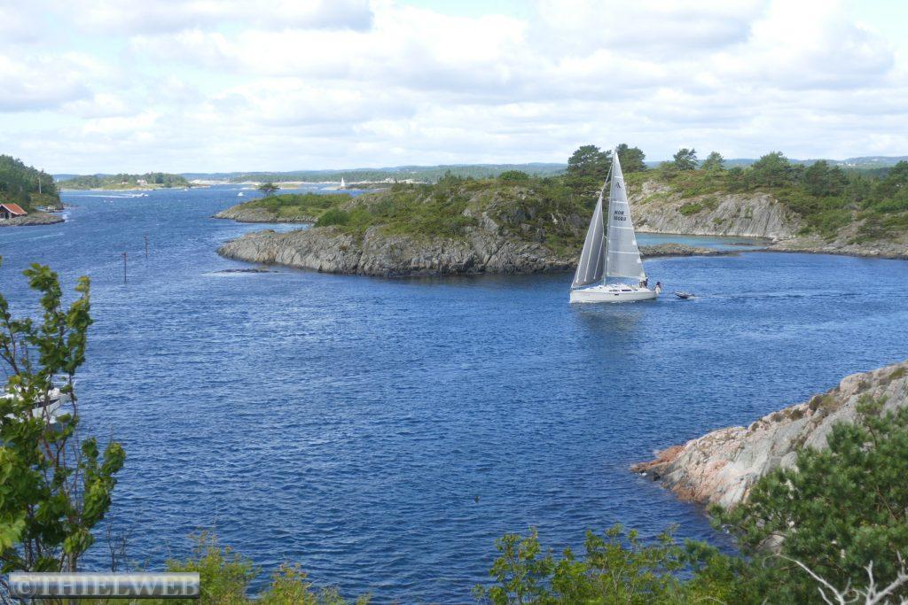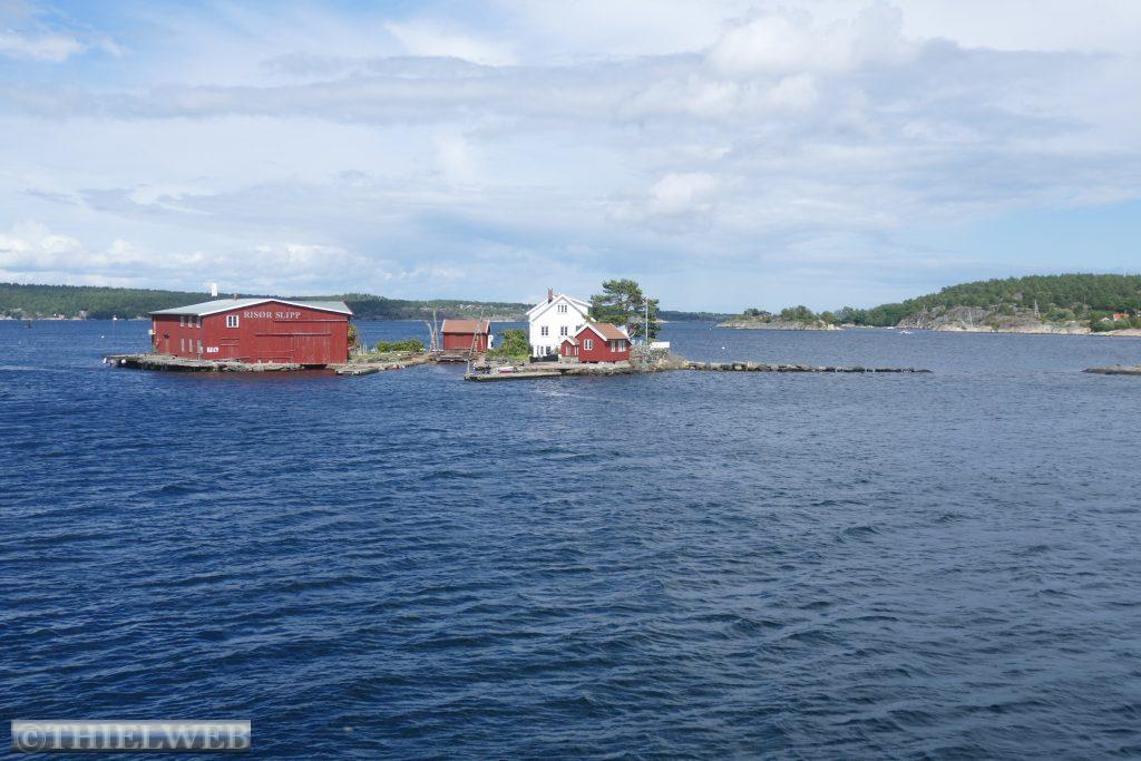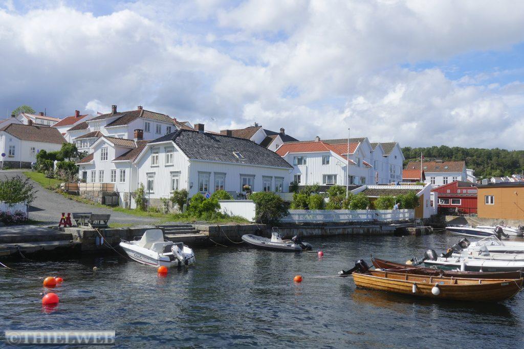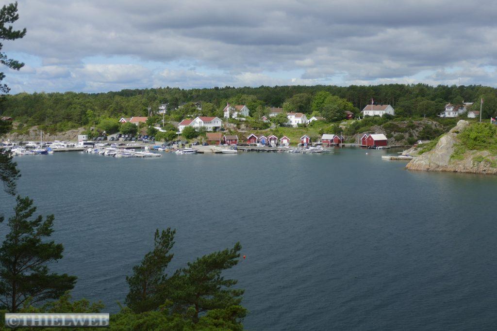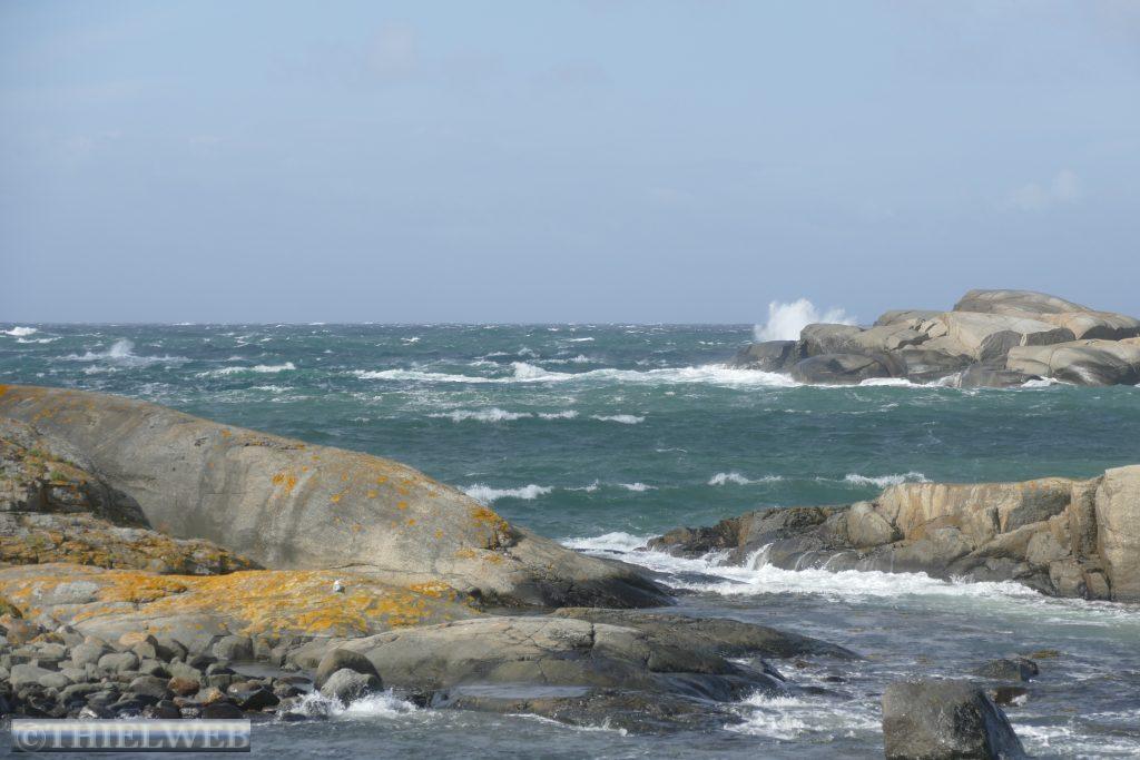 Nach einer ruhigen Nacht, in der es mehrere Male geregnet hat, fahren wir ein kleines Stück zurück um dann auf die Landzunge des Oslofjords bis nach Verdens Ende, dem Ende der Welt, mit fantastischem Blick auf Skagerrak. Der Wind peitscht kräftig und die Wellen brechen sich an hunderten kleiner Schären. Im Anschluss fahren wir 165 km weiter nach Risør. Eine abenteuerliche kleine Straße mit ordentlicher Steigung ist die Anfahrt zu unserem Parkplatz am Risørflekken. Zum Glück ist gerade noch ein Platz frei. Wir warten den erneuten kräftigen Regenschauer ab, bevor wir zum Aussichtspunkt gehen und anschließend hinunter in die Stadt mit ihren malerischen, weißen Holzhäusern. Da wir auf diesen engen Parkplatz nicht über Nacht bleiben wollen, wechseln wir zu einem etwas außerhalb gelegenen Platz an den Risørhallen.