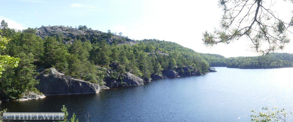 In der Nähe von Kristiansand gibt es zwei spektakulär geformte Felsformationen, den Lille Prekestolen und Lille Kjeragbolten. Sie ähneln ihren populären Geschwistern am norwegischen Lyseefjord, den Prekestolen und Kjeragbolten sind jedoch mit ca. 100 m Höhe nicht so abenteuerlich hoch und leichter zu erwandern. Wir nehmen die Wanderung in Angriff am See Fiskåvannet im Wandergebiet Vågsbygdskauen. Die Wanderung durchquert einige Täler mit steilen An- und Abstiegen zwischen Felsformationen und über Brücken überqueren wir Bäche und Flussläufe. Blaubeersträucher unterbrechen unser Wanderung immer wieder. Auf dem Plateau Prekestolen endet der Weg abrupt auf einem ca. 100 m überhängenden Felsen mit fantastischer Aussicht. Nach ca. 6 km sind wir am Wohnmobil zurück.