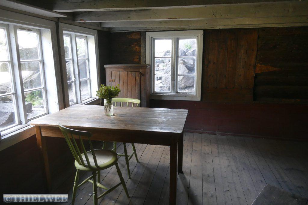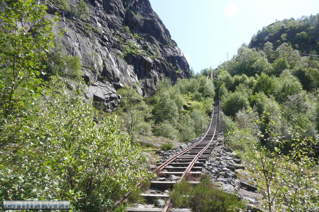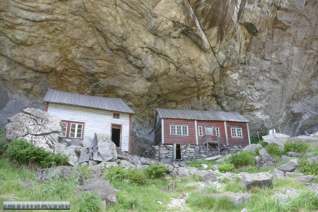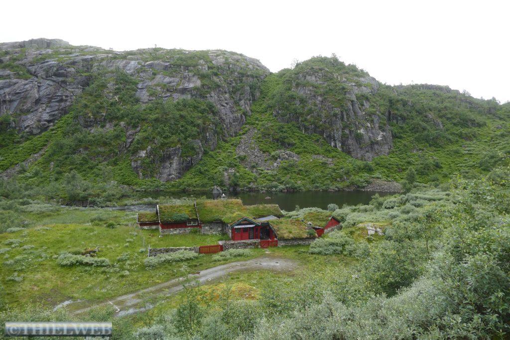 Danach fahren wir weiter durch eine fantastische Felslandschaft bis zu den beiden kleinen Häusern von Helleren, geduckt befinden sie sich unter dem grauen Gestein. Hinter dem roten Haus findet man einen Eimer, in dem seit ewigen Zeiten Tropfen aus einer Sickerquelle fallen. Um die Aussicht auf den Jøssingfjord genießen zu können, steigen wir entlang der alten Bahnstrecke auf den Fladen.