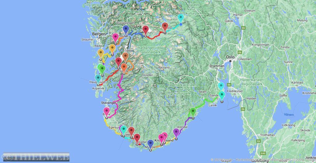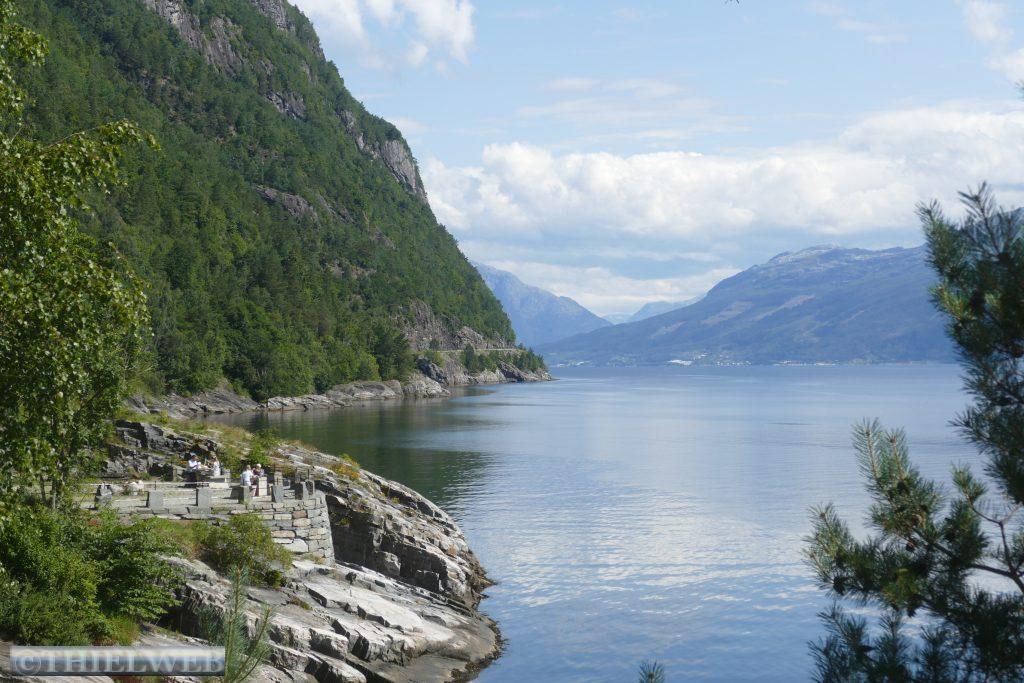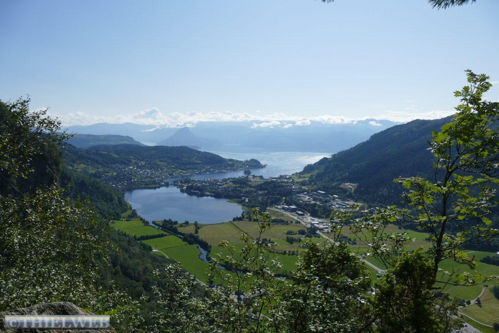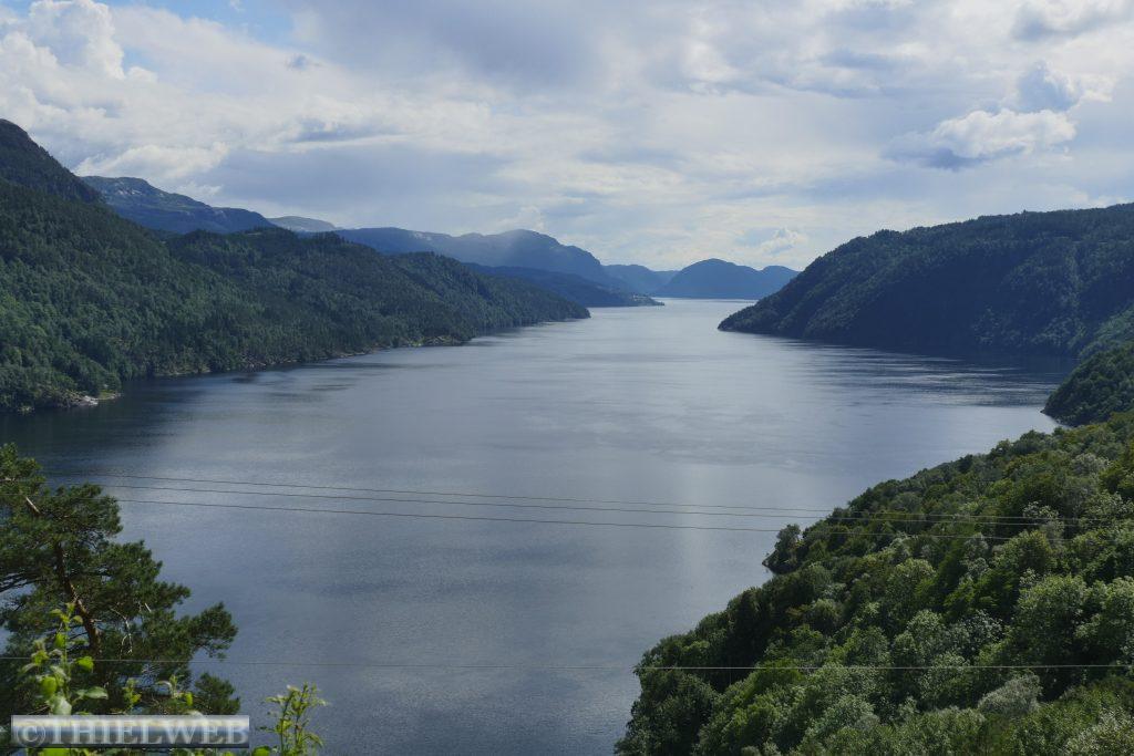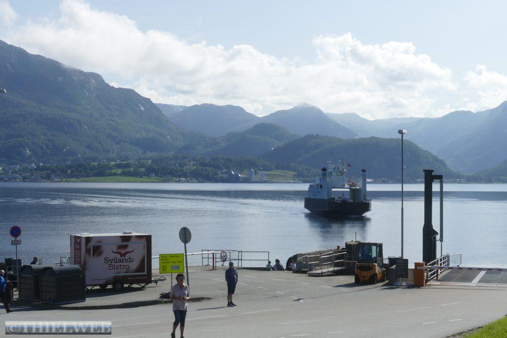 Heute wollen wir auf der Landschaftsroute Ryfylke weiter in Richtung Norden fahren. Bei Lauvvik nehmen wir heute unsere erste Fähre nach Oanes. Die Straße Nr. 13 verläuft durch das Inselreich des Lysefjords bis ins Hochland in Sauda. Kahle Hochgebirge, grüne üppig bewachsene Hügel und tiefe Fjorde mit steilen Berghängen begleiten die Straße und wir halten immer wieder für ein Foto an. Der erste Aussichtspunkt ist Høllesli mit tollem Blick auf den Lysefjord. Von Hjelmeland nach Nesvik nehmen wir die zweite Fähre. Sie fährt so ruhig und leise, dass wir erst gar nicht bemerken, dass wir bereits fahren. An der Westseite des Sandsfjords stoppen wir am Rastplatz Ostasteidn direkt hinter der Sandsfjordbrücke, bevor wir in Ropeid kurz an der Fähre, die derzeit nicht in Betrieb ist, ein Foto machen. Mit gewaltiger Kraft stürzt der Svandalsfossen in die Tiefe. Der kleine Parkplatz ist besetzt und wir warten, bis ein Auto wegfährt, bevor wir die Stufen entlang des Wasserfalls erklimmen. Anschließend suchen wir uns einen Parkplatz für die Nacht in Sauda.
