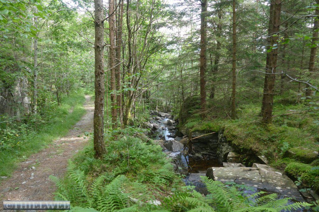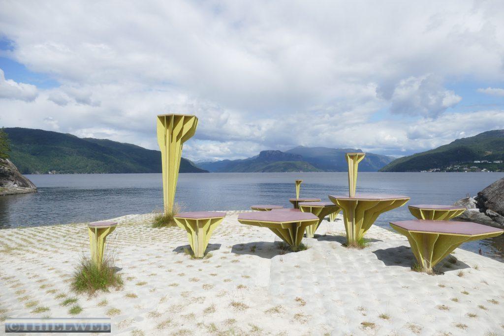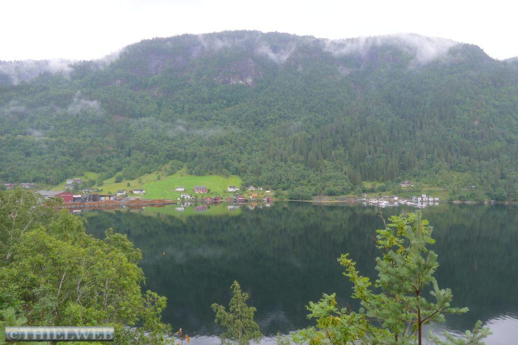 Wir setzten anschließend unsere Fahrt fort, überqueren die Brücke über den Fyksesund und kommen zum Rastplatz in Steinstøberget. Von hier blicken wir auf den Hardangerfjord und den Gletscher Folgefonna. Ein paar Kilometer weiter starten wir zu unserer zweiten Wanderung durch das Naturschutzgebiet Barlindflaten. Ein Waldweg führt uns durch uriges Gelände, wobei wir mehrere Bachüberquerungen haben. Der Rückweg erfolgt über die Straße Nr. 7. Da wir dazu keine Lust haben, fragen wir einen Norweger, ob er uns mit zurücknimmt. Er kennt den Wanderweg, den wir gegangen sind, und bringt uns bis zu unserem Parkplatz. Wir folgen der Straße noch bis zum Rastplatz Tyrvefjøra. Hier hat die Norwegische Straßenverwaltung eine Toilette errichtet, deren Gebäude aus zwei separaten Toiletten besteht. Die aus Kiefernstämmen und Beton errichtete Toilette hat ein Dach, was über der Landschaft zu schweben scheint.