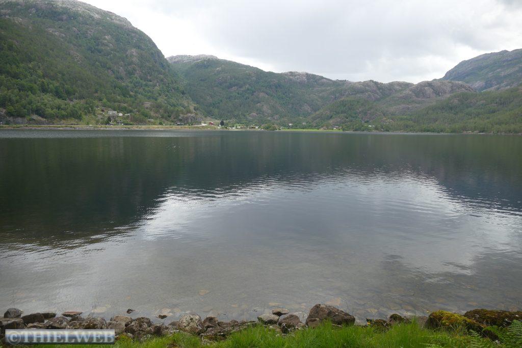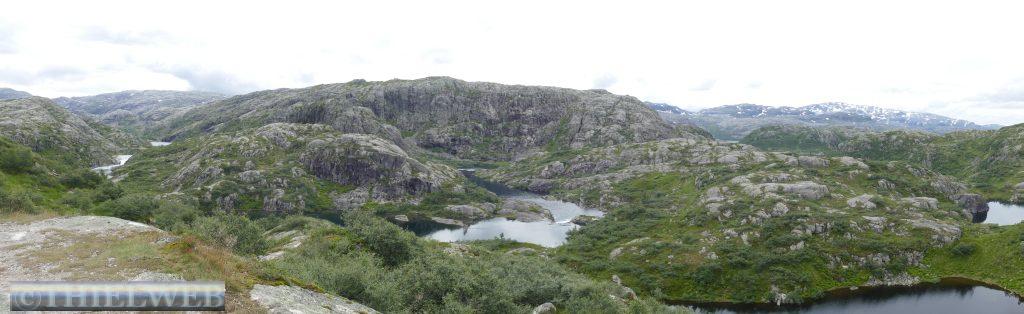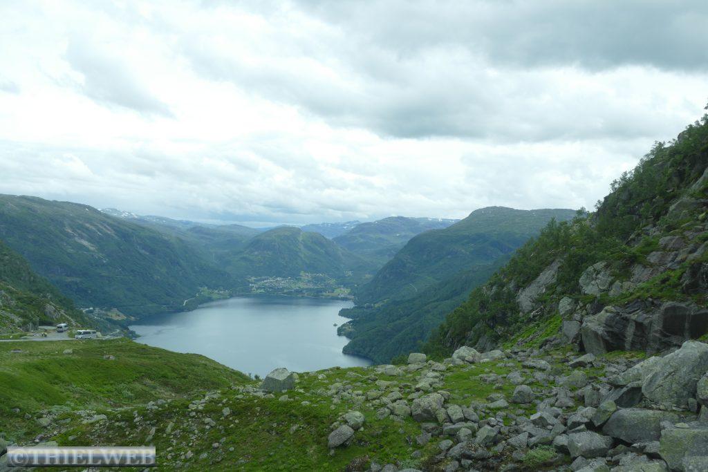 Wir setzten unsere Fahrt auf der Landschaftsroute Ryfylke fort und fahren auf dem Gebirgspass nach Røldal. Wir haben gerade Sauda hinter uns gelassen, als sich ein Steinchen in unsere Windschutzscheibe „verknallt“. Zum Glück ist diese mehrfach verklebt, sodass wir die Scheibe in Deutschland reparieren lassen können. Die Landschaft wird immer grandioser. Wir erreichen fast 1.000 Höhenmeter. Kleine Schneefelder schmiegen sich an die Berge. Danach geht es steil bergab und auf der Straße Nr. 13 Richtung Odda. Nach ein paar Kilometern biegen wir auf die Straße 134 ab und machen Stopp in Rullestad. Vom Parkplatz führt ein Rundweg um den See Rullestadvatnet. Zwei Wasserfälle stürzen von den Bergen herab. Über Wurzeln verläuft der Weg gesäumt von Heidelbeersträuchern. Mehrere kleine Bäche müssen wir über Steine queren. An einer abschüssigen Stelle hilft ein Seil. Zwischendurch schüttet sich eine Wolke aus.