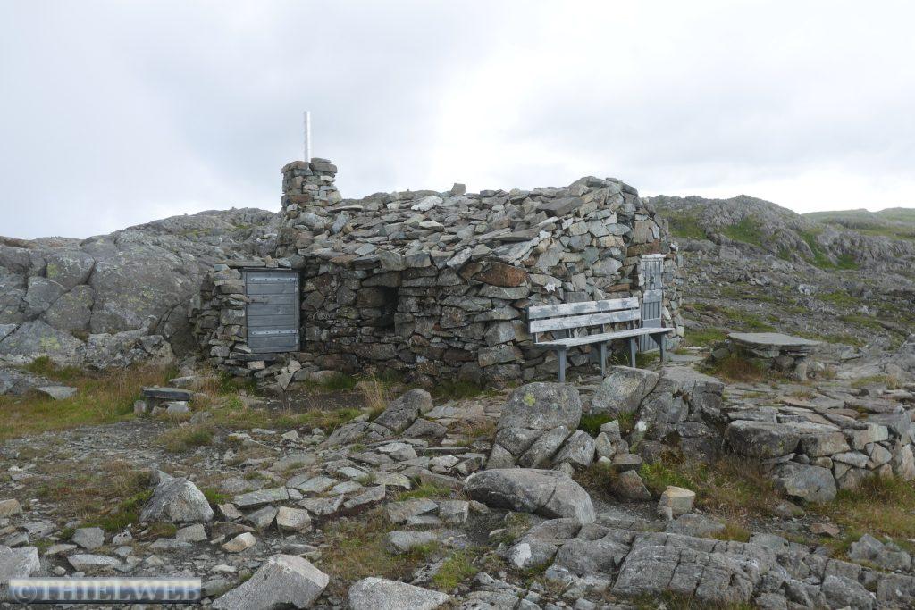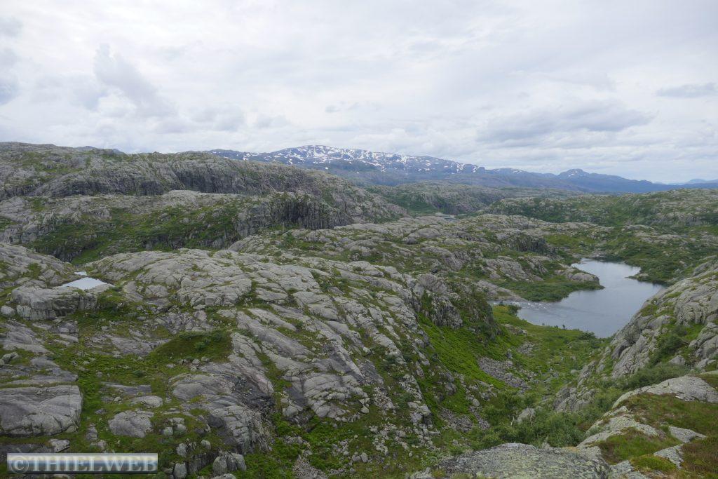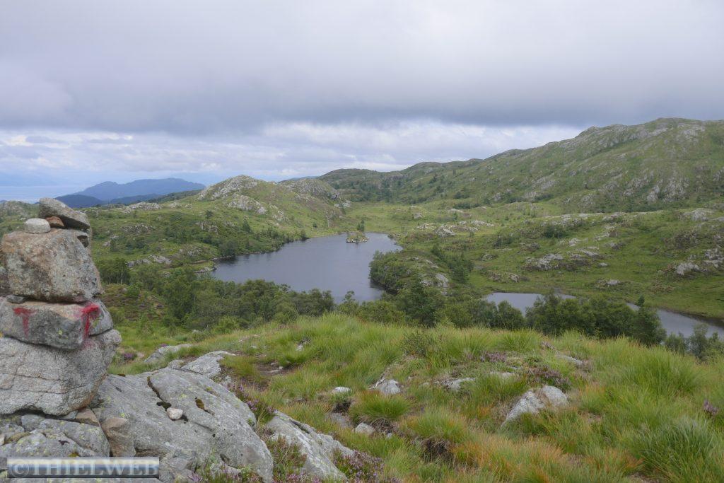 Mal wieder leichter Nieselregen am Morgen, wir fahren weiter Richtung Norden durch den Bømlafjordtunnel, der mit 7890 m zweitlängste Unterwassertunnel Norwegens. In Vistvik parken wir an der E39 und wandern von 30 m Höhe auf den Tindane mit 575 m über dem Meer. Am Anfang ist ein gewaltiger Anstieg auf einem Schotterweg bis zum Abzweig Tindane. Danach geht es gefühlt unendliche Zeit über Moor, wir müssen immer überlegen, wo wir den nächsten Schritt hinsetzen, um nicht zu versinken. Jeder rettende Stein wird genutzt. Auf den Flächen blüht gerade das Wollgras. Oben angekommen steht die kleine Steinhütte Tindaslottet von der wir eine gute Aussicht auf Teile von Sunnhordland haben. Doch da schon wieder dunkle Wolken heraufziehen, machen wir uns auf den Rückweg, wobei wir am See Svartavatnet vorbeikommen. Bergab entlang des Kvednavatnet-Sees kommen wir nach 11 km zum Wohnmobil zurück.