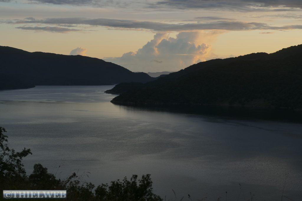 Danach fahren wir noch ein Stück weiter und suchen uns einen Platz für die Übernachtung. Schon von Weitem sehen wir eine riesigen Wasserfall aus x Metern hinunterstürzen. Wir halten am Langfoss Wasserfall, mit 612 m der fünfthöchste Wasserfall Norwegens. Danach biegen wir von der Hauptroute ab und folgen der alten Straße Åkrafjordvegen, wo wir einen traumhaften Schlafplatz finden. Schade, dass es mal wieder in Strömen regnet.