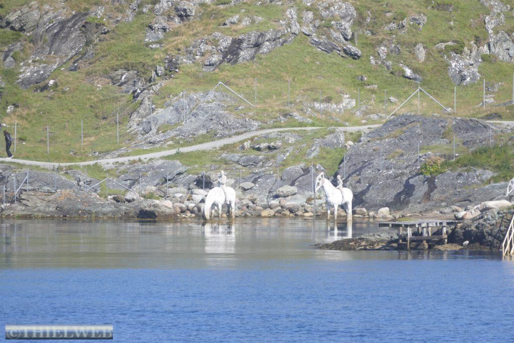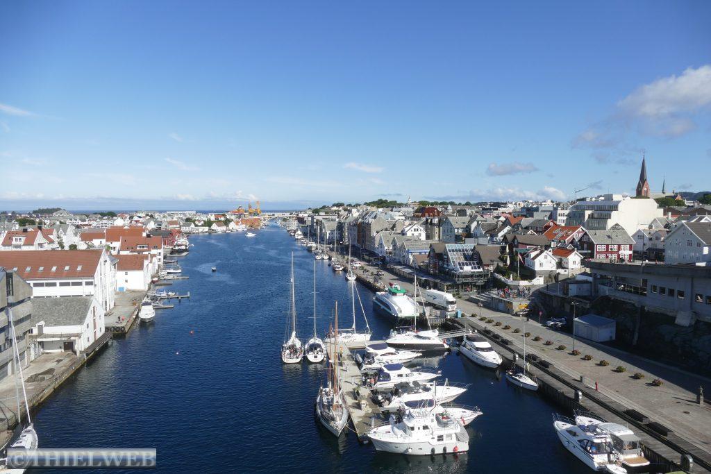 Wir werden von der Sonne geweckt und gehen nach dem Frühstück in die City von Haugesund. Nach dem Besuch der Touristeninformation sehen wir uns die Stadt und die Hafenpromenade am Smedasund an. Nicht weit vom Stadtzentrum befindet sich das riesige Monument Haraldshauen, dass dem ersten König Norwegens, der hier begraben worden sein soll, Harald Schönhaar, gewidmet ist. Gleich daneben befindet sich der Hügel Krosshaugen auf dessen Gipfel steht ein altes Steinkreuz, das an die Christianisierung Norwegens erinnert. Wir wandern die 1,3 km zum Leuchtturm Kvalen Fyr und können von hier The Rising Tide gegenüber sehen. Das ursprünglich an der Themse in London ausgestellte Monument der vier Hybridskulpturen. Ölfördermaschinen verschmelzen mit der Pferdeform und erinnern an das ehemalige Arbeitspferd, während sie gleichzeitig auf unsere Abhängigkeit von fossilen Brennstoffen und die möglichen Folgen für den Klimawandels aufmerksam machen.